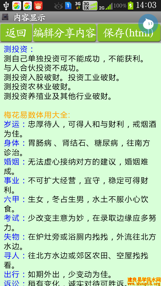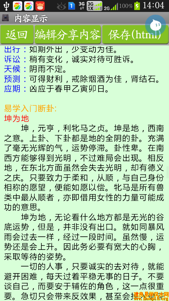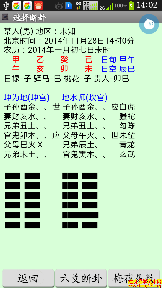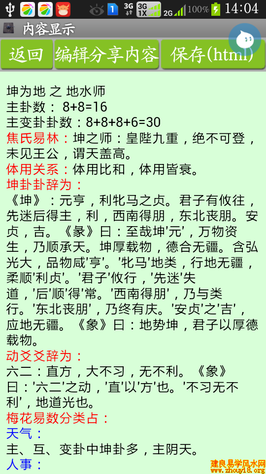 坤为地 之 地水师 主卦数: 8+8=16 主变卦卦数:8+8+8+6=30 焦氏易林:坤之师:皇陛九重,绝不可登,未见王公,谓天盖高。 体用关系:体用比和,体用皆衰。 坤卦卦辞为: 《坤》:元亨,利牝马之贞。君子有攸往,先迷后得主,利,西南得朋,东北丧朋。安贞,吉。《彖》曰:至哉坤'元',万物资生,乃顺承天。坤厚载物,德合无疆。含弘光大,品物咸'亨'。'牝马'地类,行地无疆,柔顺'利贞'。'君子'攸行,'先迷'失道,'后'顺'得'常。'西南得朋',乃与类行。'东北丧朋',乃终有庆。'安贞'之'吉',应地无疆。《象》曰:地势坤,君子以厚德载物。 动爻爻辞为: 六二:直方,大不习,无不利。《象》曰:'六二'之动,'直'以'方'也。'不习无不利',地道光也。 梅花易数分类占: 天气: 主、互、变卦中坤卦多,主阴天。 人事: 体用比和,谋为吉利。 家宅屋舍: 体用比和,家宅安稳,大吉大利。 婚姻: 体用比和,婚姻吉利。 坤为体卦,表示相貌一般,皮肤发黄,大腹便便。 生产: 体用比和,生产顺利。 生产日期会在八月(日、时)后。 饮食: 体用比和,饮食丰足。 坤为用卦,饮食多半会有:牛肉、土中之物、甘味、野味、五谷之味、芋笋之物、腹脏之物等。 求谋: 体用比和,求谋称意,万事皆成。 求名: 体用比和,功名称意。 求名之日会在八年(月、日)后。 求名任职之日在北方。 求财: 体用比和,财利快意。 交易: 体用比和,交易易成。 出行: 体用比和,出行顺利。 体为坤卦,自己被动出行。 行人: 体用比和,归期不远。 谒见: 体用比和,欢然相见。 失物: 体用比和,物不失,可以找回。 变卦为坎,应去北方寻找,或在水边、溪井、沟渠、酒醋边、浴缸、鱼缸等处寻找。 疾病: 体用比和,疾病易安。 官讼: 体用比和,大吉大利。 坟墓: 体用比和,所葬之地为吉地,宜安葬。 射复: 体用比和,为有用之物。 其物的数量是2个。 坤卦多,为直而方之物。 坤为体卦,其物直而方,颜色黑黄,皮或布质,车或釜,与牛有关之物。 应期: 成事或应事在16年、16月、16日、16时之内(正应卦数定)。 或者成事或应事在46年、46月、46日、46时之内(主互变三卦数定)。 如果行走问卦,以上数字减半,如果躺着问卦,以上数字加倍。 梅花易数体用大全: 岁运:忠厚待人,可得人和与财利,戒烟酒为佳。 身体:胃肠病 、肾结石、糖尿病,往南方诊治。 婚姻:无法虚心接纳对方的建议,婚姻难成。 事业:不可扩大经营,宜守,稳定可得财利。 六甲:生女,冬占生男,水土不服小心饮食。 考试:少改变主意为妙,在录取边缘应多努力。 失物:在炉灶旁或浴厕内找找,外流往北方水边。 寻人:往北方水边或郊区农田、空屋找找看。 出行:如期外出,少变动为佳。 诉讼:稍有变化,诚实对待可胜诉。 天候:阴雨不定。 预测:可得财利,戒除烟酒为佳,肾结石。 应期:凶应于春甲乙寅卯日。 易学入门断卦: 坤为地 坤,元亨,利牝马之贞。坤是地,西南之意。上卦、下卦都是地的全阴的卦。充满了毫无光辉的气,运势停滞。卦性卑。在南西方能够得到光明,不过难局会出现。相反地,在东北方面虽然会失去光明,却有德义之庆。只要致力于柔和,从顺,与自己身份相称的愿望,便能如愿以偿。牝马是所有兽类中最从顺者,亦即借用女性的力量可能成功的意思。 坤为地,无论看什么地方都是无光的谷底运势,但是,并非没有出口。就如同暴风雨会过去一样,经过一段时间。虽然慢,运势还是会上升。因此务必要有宽大的心胸,采取等待的姿势。 一切的人事,只要诚实的去对待,就能避开困难,每天过着平稳无事的日子。不要谈自己,而要安于辅佐的角色,这一点很重要。急切只会带来反效果,甚至会掉入更深的陷阱。 【买卖】虽然自以为谈得很好而开始交易,最后却没有什么利益。大的契约由于难成,即使成立也有触礁的可能性。现在不要只要目前的利益。而要踏实地积累小交易,将来这些小交易会成为自己的财产,而会在盛运的时刻里。 【借贷】关于融资交涉绝不要勉强。即使借到了钱,却因意外的开销延迟还钱,使信用扫地。借钱给别人也是如此,最坏的被倒闭。因此,为了减少损失,借贷的金额尽量要压低。 【投资】在不动产方面会听到一些赚钱的消息,不过,假使你完全相信这些传言,便会失去好不容易得到的虎子。愈是好的条件愈有毒,千万要注意。自己不轻举妄动,仔细的观察对方打出什么牌,情况才会好转。 【开业】尽量维持现况。如果想随便扩大,就会失败,结果反而必须放弃该事业。不过。例外的是,有女性带话来的时候,可以考虑。餐饮业等与生活有直接关系的事业比较容易成功。虽然如此,也不可过分勉强,长期性的计划比什么都重要。 【异动】公司内部署毫无移动的迹象,即使有人事异动,也会被调到不同的部门。所期待的别家公司挖角的声音。暂时还是不要去。但是,只要努力踏实工作,上司会对你另眼相看。有异迁、荣转的可能。 【提言】即使有话想说也要闭嘴。开会时,有人征求意见的时候。绝对不可批评他人。反之,上司或同事给你的建议要乖乖的听从,那么,你将来会发觉自己缺乏客观性的观察力,借以此为防患失败与未然。 【会面】虽然已经取得联络,仍无法和对方见面。因为生意上的拜访,对方不在的情形很多。而且一等就是几个小时。为使工作成功,要尽量压制心情,忍一字为第一要决。 【交际应酬】严禁赌博。有关胜负的任何事,无论做那一项均毫无胜算。钓鱼、打高尔夫球等