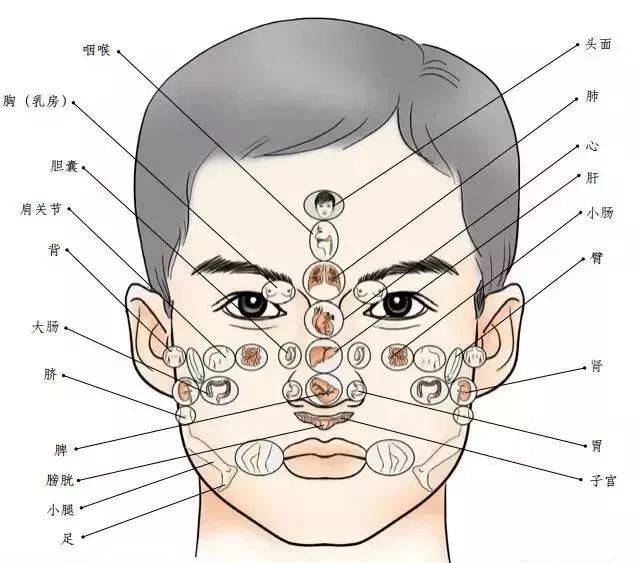 额头火星有斑痣:三横纹向(额头部位横纹深,精神压力大;有斑痣者,心脑血管有病,预防三高) 胸乳显现两眼间:(眼角发青者,患乳腺增生或乳腺癌。) 眉宇中分肝为外:(眉梢有斑者,肝有病。) 内侧心脑肺相连:(两眉中间有竖道者肺有病;横道竖道相连者心有病。) 肺主皮毛窍于鼻:(酒糟鼻,毛孔粗大者肺有病。) 脾主肌肢白唇边:(唇有白道,肌肉无弹性者脾有病。) 准头主脾两翼胃:(鼻头发红有坑毛孔粗大者脾有病;鼻翼鼻唇沟发红者胃有病。) 鼻梁中肝两侧胆:(鼻梁中间有斑者肝有病;两侧有斑者胆有病。) 肝主筋脉华在爪:(肝不好者指甲有竖纹,手脚抽筋。) 恰好开窍于双眼:(肝不好者眼干涩,视物不清。) 舌上为肾中为心:(舌根部为肾区,黑 ,黑者有肾病;舌中部为心区。) 心窍于舌华在面:(舌有裂缝、脸红有血丝者心脏有病。) 大肠本在颧骨外:(颧骨外发黑发红者大肠有病。) 小肠颧内即可见:(颧骨内侧发黑或眼袋早现者小肠有病。) 巧嘴一张生殖器:(唇上有斑或有皱生殖器有病。) 人中膀胱相关联:(人中有斑或痣,男有膀胱瘤,女有子宫肌瘤或卵巢囊肿。) 水星地阁是肾区:(下巴壳或耳发黑、有斑者有肾病。) 主骨生髓非等闲:(肾不好者腰痛、腿沉、记忆力差、牙不好、阳痿早泄。) 开窍于耳一脉通:(肾不好者耳聋耳鸣。) 其华在发可直观:(肾不好者脱发、白发) 颜面望诊熟于心:(烂熟于心如子弹上膛。) 不是神仙胜神仙。(功力到家如虎添翼。) 肝 1. 胆主目:肝胆不好的人,眼睛就不好,他的白眼仁发黄,很浑浊,不透明,象近视眼,花眼,有的总爱眨巴眼睛,这都是因为肝功能较弱。 2. 肝功能不好的人,他的指甲上有横纹,竖纹或灰指甲。他的筋是鼓出来的,青筋暴流,中医叫爪甲不滑,这些人爱抽筋,西医讲的是缺钙。 3. 肝胆不好的人,情绪是爱发怒的,因一点小事就大发脾气,说发火就发火。 4. 肝胆不好的人,食性是爱吃酸的,象山楂,山杏等,一吃就能吃很多。 5. 肝胆不好的人,脸色是青灰色,无光泽,每天总象没洗脸似的。 反射区:眉毛中间1/2处往外到眉尾这三角区是肝区,还有鼻梁中段也是肝区。 如果在这些地方长斑、长疙瘩、红点或黑痣等,可以断定他肝胆有毛病,有的人在这些地方长很明显的黑斑,那是他的肝脏有问题了,因为人的脸上是不会长东西的,象儿童脸上就干干净净。 胆 反射区域:在鼻梁中段外两测部位。 1.部位有红血丝状、青春痘,或早晨起床后嘴里发苦,说明胆部有了较微炎症; 2.若有斑,有暗影,可能有胆囊炎。 3.若此部位有竖褶子、或笑时有竖褶子,说明此人胆囊有问题。 4.若此部位有痣、痦子,证明胆功能先天不足。 5.若把右手放在右肋下(胆就在此部位),左手握拳击打右手背,若此部位疼痛的话,即是胆囊炎; 6.若刺痛的厉害的话,可能是胆结石。胆有问题的人可能肥胖。 7.眼下面胆区有一对明显的斑或有痣、痦子,是胆结石。眼袋晦暗亦证明胆不好。 心 脏 反射区域(一):在额上1/3至发际处(即发际一圈) 1.此处出现青春痘,或和面部额色不一样,说明此人心理压力比较重。 2.此处有斑;说明心脏有疾病(如:心肌无力); 3.此处有痣、痦子,说明心脏功能先天不足。 反射区域(二)在两眼角之间的鼻梁处 4.此处出现横纹或横纹比较明显,说明心律不齐或心脏状况不好; 5.若出现的横纹很深,而且舌头上面也有很深的竖纹(沟),可能是有比较严重的心脏病。 6.心脏不好的人脸上布满红血丝,象爬满了许多小虫子似的,这样的人血液循环系统不好。 脾 胃 脾反射区域:在鼻头,胃反射区域:在鼻翼,二侧凹处为十二指肠区。 1.嘴唇发白,没血色,嘴唇很干,爱爆皮,裂口子,脾胃功能不好。 2.脾胃功能不好的人,肌肉松懈,没有弹性。 3.脾胃功能不好的人,老是皱着眉头,好像在思考问题,其实什么事也没有。 4.脾胃功能不好的人,脸色发黄,老皱眉头。 5.红鼻头,酒渣鼻,鼻子头有红血丝,黑斑,长疙瘩等。 6.鼻头发白,没有血色,特别白,这样的人是脾虚,会贫血。鼻头发黄,也是脾虚,会出现汗多、畏风、倦怠、不嗜食等 。 7.鼻窝总是很脏,发黑,油乎乎的总象没洗干净似的,或是长疙瘩,这样的人胃功能不好。 8 .若鼻翼发红,是胃火,易饥饿,口臭。有红血丝且比较严重,一般是胃炎。 9.若鼻翼灰青,是胃寒,与其握手时能感到此人手指尖发凉,此人受风寒肚子痛,拉稀等。 10.脾区出现斑或痣,有脾肿大的可能,胃区出现斑和痣,可能会有溃疡和其他病变。 肺 肺是给皮毛输送营养的,肺功能不好的人脸上的皮肤比较粗糙,毛孔大,头发焦黄,爱开叉,没光泽,肺功能不好的人。 肺的反射区域在两眉1/2之间;额头1/3以下的部位,就是印堂这个位置。 1.如果印堂这块发红,是近期有上呼吸道感染的病症, 2.印堂发暗,黑色的那种暗,这样的人可能有病变,应及早去医院检查。 3.若额头中间比较凹,且颜色晦暗、或发青、或有斑,说朗此人肺部有疾病,呼吸不畅; 4.如有粉刺,证明此人近期患过感冒或喉咙疼。 5.若两眉头部位有痣、痦子或发白,则证明此人有咽.喉炎、或扁桃体炎,或胸闷气短,或肺有病。 6.眉头向上部有凸起,也是有肺疾。 肺功能不好的人,一般大肠排泄功能不好。 大 肠 反射区域:在颧骨下方偏外侧部位从眼珠到外眼角往下至嘴角一齐,这个位置是大肠。 1.若此部位有红血丝、青春痘、斑、痣、痦子,说明此人大肠排泄功能失调,一般会大便干燥、便秘。 2.若此部位有呈半月状的斑,证明此人是便秘或痔疮。 3.大