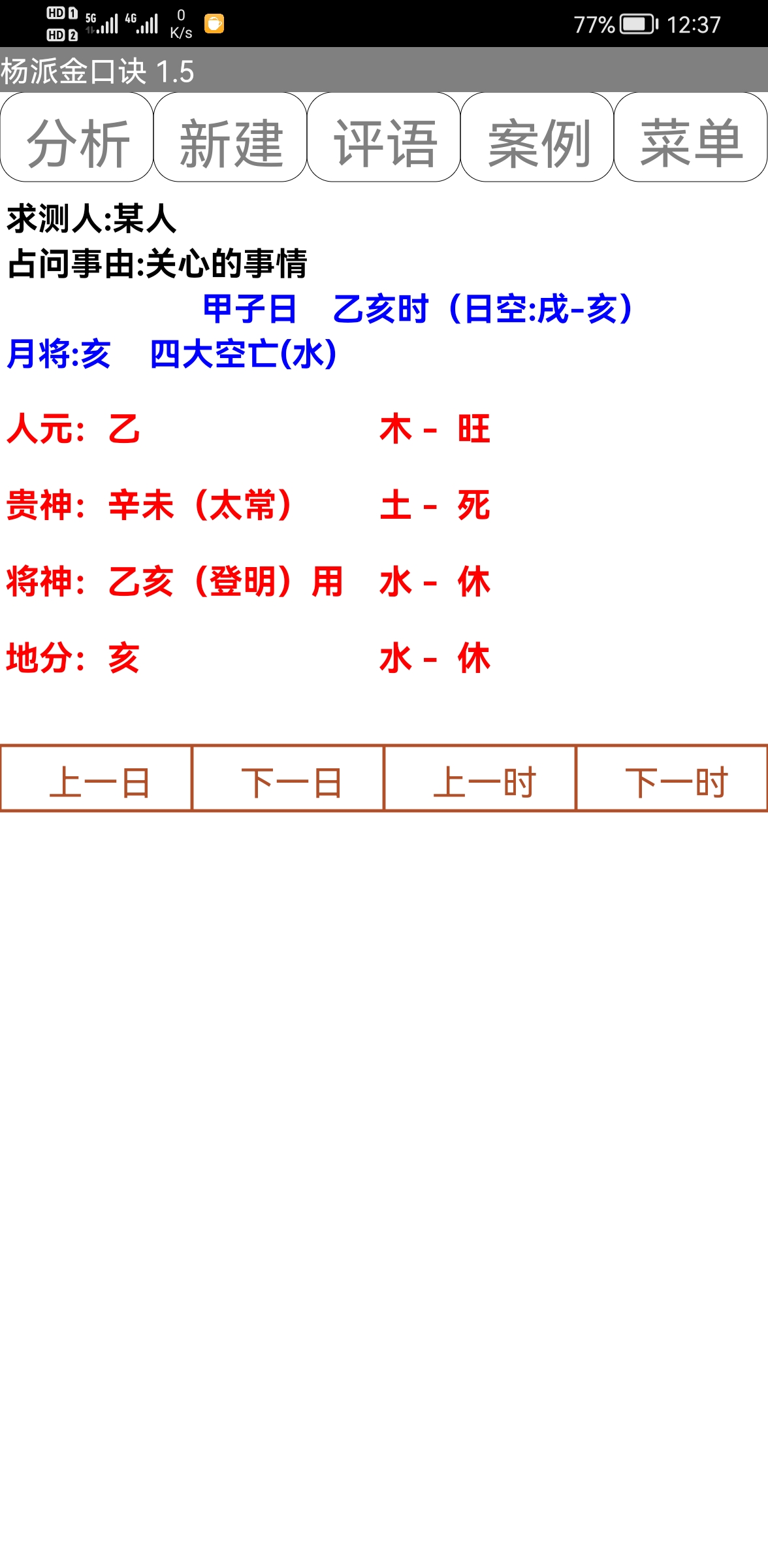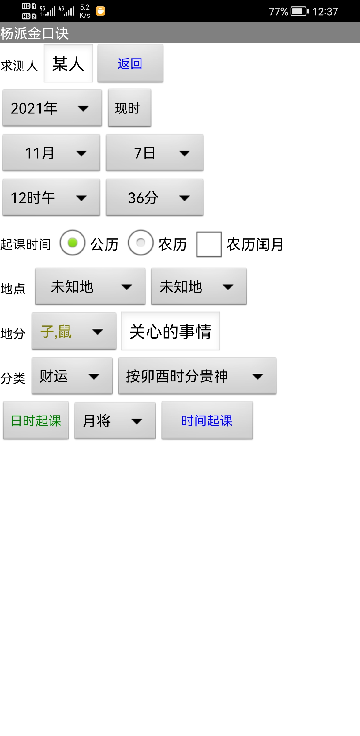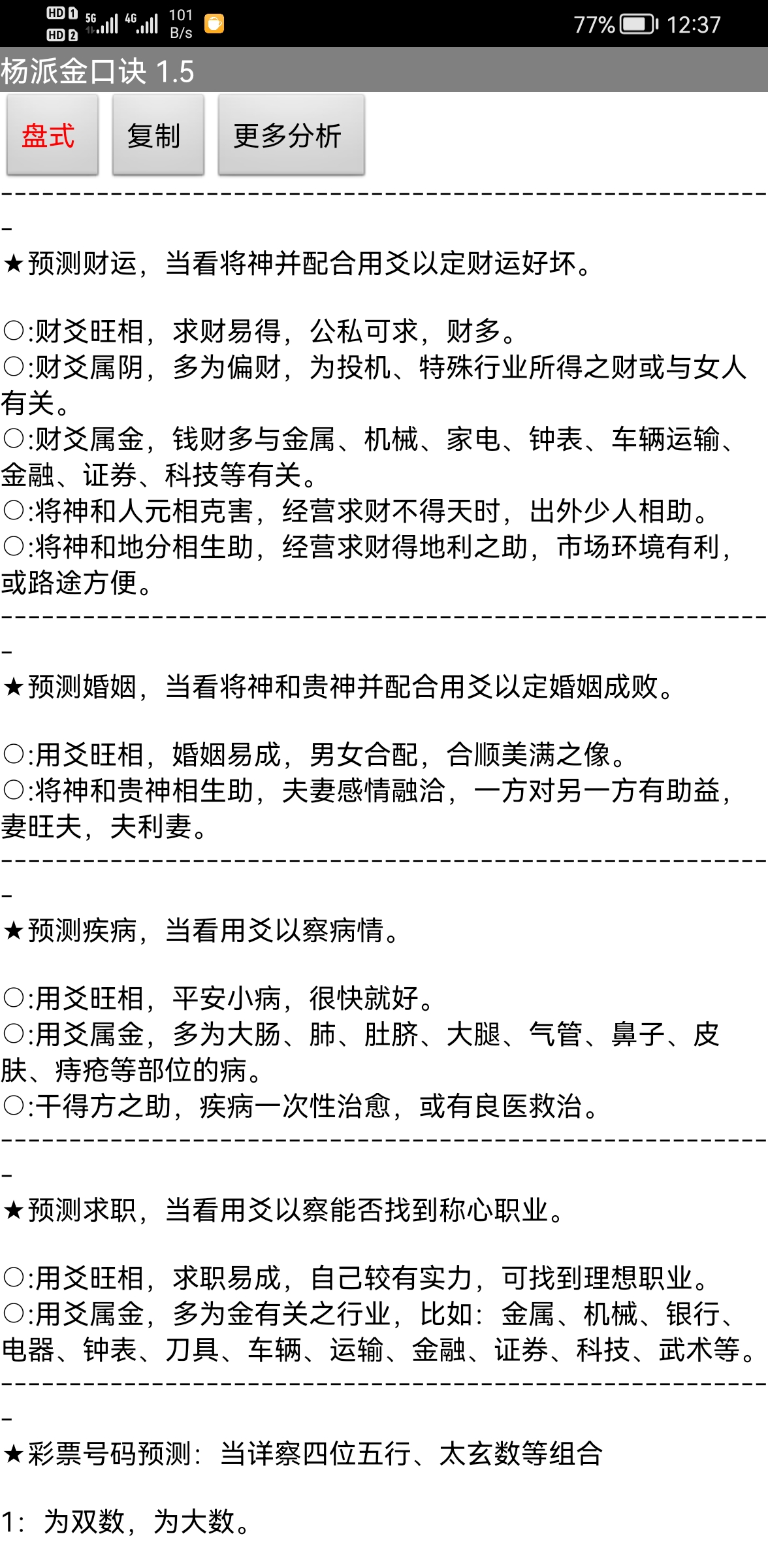 手机安卓系统\鸿蒙系统均可使用 售价:150元 有需要者加微信gn413168 软件说明: 1:运行环境:手机安卓系统\鸿蒙系统均可使用 2:本软件为绿色软件,安装软件时只完成复制,卸载时直接删除,不会往你的系统文件夹拷入文件,不会 修改注册表,请放心使用,不带任何插件。 3:本软件为共享软件,未注册有功能限制,但没有时间限制。注册后你可以使用所有功能,并且享受软件 日后的免费升级,和使用时作者亲自提供的技术支持。 4:你可以分发、传播这个软件,但作者拥有对软件的所有权。请不要对它进行反汇编、破解,谢谢你的合 作。 ================================================================ ※ 杨派金口诀 1.5 正式版 ※ 金口诀是周易预测学的一个分支,由于其学习资料少,令很多易学爱好者不得其门而入,利用此款 软件不但可排出课盘,还有适当的断语可供参考,并可预测财运、婚姻、疾病、求职这四类事情,适合命 理研究者、爱好者使用。 一:操作使用说明: 1:在右边输入预测时间,选择预测地。(软件支持北京时间、真太阳时等,可以在软件设置里面调整) 2:选择起贵人方式,默认是以卯时到酉时起白天贵人,余下时间起夜晚贵人。也可直接指定贵人方式。 3:输入地分,可选择,也可直接输入数字。 4:点“起课”就可以了。 快捷功能:上面一排的“上一日”、“下一日”、“上一时”、“下一时”,可以在已经排出的盘式上, 快速增减当前时间,排出新的课盘。 提示:另外一种起课方法:点“起课”按钮上面的“日时起课”,可以直接指定月将、日柱、时柱、地分 起课。 ====================软件设置选项说明============================= 一:使用时间,支持北京时间、真太阳时、地方时。如果使用“真太阳时”,起课的时候要指定预测地点 。 二:贵人起法、月将起法自己选择合适的选项即可。 三:贵人起法 1:甲戊庚牛羊:甲戊庚三干(阳贵丑、阴贵未)。 2:甲羊戊庚牛:甲(阳贵未、阴贵丑),戊庚(阳贵丑、阴贵未)。 其他几个天干都一样:乙己(阳贵子、阴贵申),丙丁(阳贵亥、阴贵酉),壬癸(阳贵巳、阴贵卯) ,辛 (阳贵午、阴贵寅) 。 四:旺衰定法 1:按多寡、生克来定,全面考虑课式里面的人元、贵神、将神、地分得出,原则是“不受克者为旺; 课内同类多者为旺”。 2:按四时节气,例如卯月,就是木旺、火相、土死、金囚、水休,其他月份以此类推。 ================================================================= 二:历史记录管理 1:软件可以保存无限多的案例,并可以方便地查找、编辑、修改历史记录。 2:记录管理功能,可在软件左边的案例列表上查看右键菜单。 3:查看历史记录时,如果进行了修改,可以点击“布卦”按钮上方的“存旧”图标,保存修改后的文本。 4:软件启动时,只显示最近保存的最多 1000个案例,如果要显示全部或者查找指定类别,可以按鼠标右 键 ,执行对应功能。 求测人:某人 预测地:未知地-未知地 起课公历:2021年11月7日12时36分(北京时间)。 起课农历:二○二一年 十月 初三日 午时。 干支:辛丑年 戊戌月 己未日 庚午时。 月将:卯 日空(子-丑、甲寅旬) 四大空亡(金) 金口诀课式: 人元:甲 木 + 死 六甲 贵神:乙丑(贵人) 土 - 休 将神:癸酉(从魁) 用 金 - 旺 天医,截路 地分:子 水 + 相 病符,飞廉 【课盘解析】 人元再遁:甲,神干再遁:丁,将干再遁:辛 ※课内二阳二阴,以将神为用爻,以阴阳辨男女,取事以将神为主,关于事情成败吉凶当以用爻旺相休囚死来论。 ※用爻旺相,事情发展顺利,做事有始有终,谋事多遂自己心原。 ☆方生干为父母动,父母动为印绥,凡占小干尊,大吉,主印绶之事,文书、书馆,职称等求有得。 △人元解: 干克神,外来取索,若临门,主人谋害自己,常人损财,仕人失位,不宜求干,官事主散,官受受克故耳。 △贵神解:丑未贵神、日支相冲,丑午贵神、时支相害,戌未丑月支、日支、贵神恃势之刑, 神克方,隔手求财虽难得,事主晚成。 神生将,所谋顺遂,内外和谐,人将财物助我,行人将至。 △将神解:酉戌将神、月支相害, 将克干,喜事重重,求财必得,求名必遂,科举上榜,宜远行。 将生方,名回天覆,家人内合,使今有人助我,主亲人分别远行,财帛有喜,子孙兴荣。 △地分解:子丑地分、年支六合,子未地分、日支相害,子午地分、时支相冲, --------------------------------------------------------- ★预测财运,当看将神并配合用爻以定财运好坏。 ○:财爻旺相,求财易得,公私可求,财多。 ○:财爻属阴,多为偏财,为投机、特殊行业所得之财或与女人有关。 ○:财爻属金,钱财多与金属、机械、家电、钟表、车辆运输、金融、证券、科技等有关。 ○:将神和人元相克害,经营求财不得天时,出外少人相助。 ○:将神和地分相生助,经营求财得地利之助,市场环境有利,或路途方便。 --------------------------------------------------------- ★预测婚姻,当看将神和贵神并配合用爻以定婚姻成败。 ○:用爻旺相,婚姻易成,男女合配,合顺美满之像。 ○:将神和贵神相生助,夫妻感情融洽,一方对另一方有助益,妻旺夫,夫利妻。 --------------------------------------------------------- ★预测疾病,当看用爻以察病情。 ○:用爻旺相,平安小病,很快就好。 ○:用爻属金,多为大肠、肺、肚脐、大腿、气管、鼻子、皮肤、痔疮等部位的病。 ○:干得方之助,疾病一次性治愈,或有良医救治。 --------------------------------------------------------- ★预测求职,当看用爻以察能否
