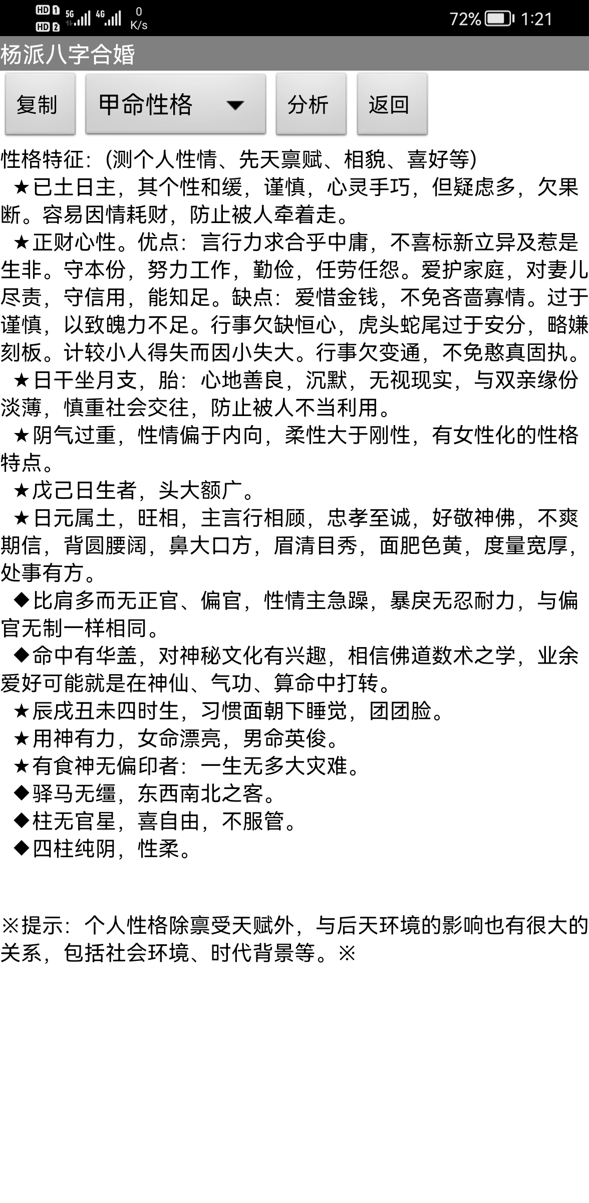 售价:150元 有需要者加微信gn413168 软件说明: 1:运行环境:手机安卓系统\鸿蒙系统均可使用 2:本软件为绿色软件,安装软件时只完成复制,卸载时直接删除,不会往你的系统文件夹拷入文件,不会修改注册表,请放心使用,不带任何插件。 3:本软件为共享软件,未注册有功能限制,但没有时间限制。注册后你可以使用所有功能,并且享受软件日后的免费升级,和使用时作者亲自提供的技术支持。 4:你可以分发、传播这个软件,但作者拥有对软件的所有权。请不要对它进行反汇编、破解,谢谢你的合作。 ================================================================ ※ 杨派八字合婚 2.0正式版 ※ 一:八字合婚: 1:点“新建”或者“开始合婚”按钮,按提示依次输入两个人的生日、性别、姓名等参数。 2:输入完毕后,软件将自动分析八字之间的关系,给出判断结果。 3:如果对八字分析给出的用神、五行力量有异议,可以点“测算”按钮上方的“设置用神”自己设置用神 、五行力量,软件将按输入的数值,重新进行运算。 提示:除了可以给男、女合婚用,也可以看两个人之间的关系,男-男、女-女都可以,据此判断两人是否有 缘。 二:结婚择日: 1:在“合婚配对”版块输入两个人的生日合婚后,可以进入“结婚择日”版块,选择要结婚的年份,软件会给出当年适合的日子、时辰。 三:历史记录管理 1:软件可以保存无限多的命例,并可以方便地查找、编辑、修改历史记录。 2:记录管理功能,可在软件左边的命例列表上查看右键菜单。 3:查看历史记录时,如果进行了修改,可以点击“布卦”按钮上方的“存旧”图标,保存修改后的文本 。 4:软件启动时,只显示最近保存的最多 1000个案例,如果要显示全部或者查找指定类别,可以按鼠标右键 ,执行对应功能。 -------------甲命八字------------- 姓名:某人 出生地:未知地-未知地。 公历:2021-11-7 13:20(北京时间),星期日。 农历:二○二一年十月初三日未时 食 比 日元 食 乾造 辛 己 己 辛 丑 亥 未 未 藏干 癸辛己 甲壬 乙己丁 乙己丁 才食比 官财 杀比枭 杀比枭 起运:0岁0个月1天,11月8日交运(公历) 劫 枭 印 杀 官 才 财 食 戊戌 丁酉 丙申 乙未 甲午 癸巳 壬辰 辛卯 养 长生 沐浴 冠带 临官 帝旺 衰 病 1 11 21 31 41 51 61 71 2021 2031 2041 2051 2061 2071 2081 2091 ※胎元:庚寅(松柏木) 命宫:己亥(平地木) ☆年命:壁上土(下元) ☆星座:天蝎座。 生肖:牛 命局生克制化: 个数(计干): 2旺水 3相木 2死火 5囚土 3休金 个数(不计): 1旺水 0相木 0死火 5囚土 2休金 力量:水75(26.6%) 木24(8.5%) 火10(3.5%) 土98(34.8%) 金75(26.6%) 己生助:108(38.3%) 克泄耗:174(61.7%)。 阴气:204(72.3%) 阳气:78(27.7%)。 ※日主综合得分:-2。 日元偏弱,喜用火,土(印枭、比劫)。忌仇水,金(财星、食伤)。 己土生于亥月,水旺、木相、金休、土囚、火死。 生于寒冷冬季,八字可适当借火调候。 ※此命局未入正格。 ※天干无合。地支有丑未年日相冲,丑未年时相冲。 -------------乙命八字------------- 姓名:某人 出生地:未知地-未知地。 公历:2021-11-7 13:20(北京时间),星期日。 农历:二○二一年十月初三日未时 食 比 日元 食 坤造 辛 己 己 辛 丑 亥 未 未 藏干 癸辛己 甲壬 乙己丁 乙己丁 才食比 官财 杀比枭 杀比枭 起运:9岁10个月23天,9月30日交运(公历) 伤 食 财 才 官 杀 印 枭 庚子 辛丑 壬寅 癸卯 甲辰 乙巳 丙午 丁未 绝 墓 死 病 衰 帝旺 临官 冠带 11 21 31 41 51 61 71 81 2031 2041 2051 2061 2071 2081 2091 2101 ※胎元:庚寅(松柏木) 命宫:己亥(平地木) ☆年命:壁上土(下元) ☆星座:天蝎座。 生肖:牛 命局生克制化: 个数(计干): 2旺水 3相木 2死火 5囚土 3休金 个数(不计): 1旺水 0相木 0死火 5囚土 2休金 力量:水75(26.6%) 木24(8.5%) 火10(3.5%) 土98(34.8%) 金75(26.6%) 己生助:108(38.3%) 克泄耗:174(61.7%)。 阴气:204(72.3%) 阳气:78(27.7%)。 ※日主综合得分:-2。 日元偏弱,喜用火,土(印枭、比劫)。忌仇水,金(财星、食伤)。 己土生于亥月,水旺、木相、金休、土囚、火死。 生于寒冷冬季,八字可适当借火调候。 ※此命局未入正格。 ※天干无合。地支有丑未年日相冲,丑未年时相冲。 --------------------------------------------------------- 婚姻配对分析: 婚配指数:64分 ☆乙命对甲命有41%的补益作用力,甲命对乙命有41%的补益作用力。 ☆双方喜用神互相生助,有共同点,容易相处。 ☆双方八字交会后,五行平衡性为75%。 ☆双方八字交会后,阴阳平衡性为55%。 ☆甲乙命日元搭配不和谐,相处不容易。 ☆甲乙命生年无害,可以交往! ☆九星合婚得:绝命,男女更有忧亡。 ☆甲命天蝎座,乙命天蝎座,较为和谐的一对。 ☆男命生日密码:5,女命生日密码:5,两人不适合在一起,没有姻缘。 ★甲命对照乙命:天干无合。地支有亥亥甲月乙月自刑。 ★乙命对照甲命:天干无合。地支有亥亥乙月甲月自刑。 ※提示:指数有在60分以上,双方可以交往,喜配良缘的机会大。80分以上者,如能婚配真是天生的一对。※ ---------------------甲命性格------------------------- 性格特征:(测个人性情、先天禀赋、相貌、喜好等) ★已土日主,其个性和缓,谨慎,心灵手巧,但疑虑多,欠果断。容易因情耗财,防止被人牵着走。 ★正财心性。优点:言行力求合乎中庸,不喜标新立异及惹是生非。守本份,努力工作,勤俭,任劳任怨。爱护家庭,对妻儿尽责,守信用,能知足。缺点:爱惜金钱,不免吝啬寡情。过于谨慎,以致魄力不足。行事欠缺恒心,虎头蛇尾过