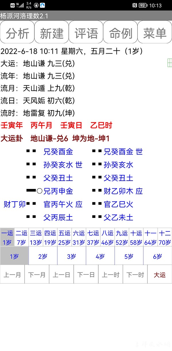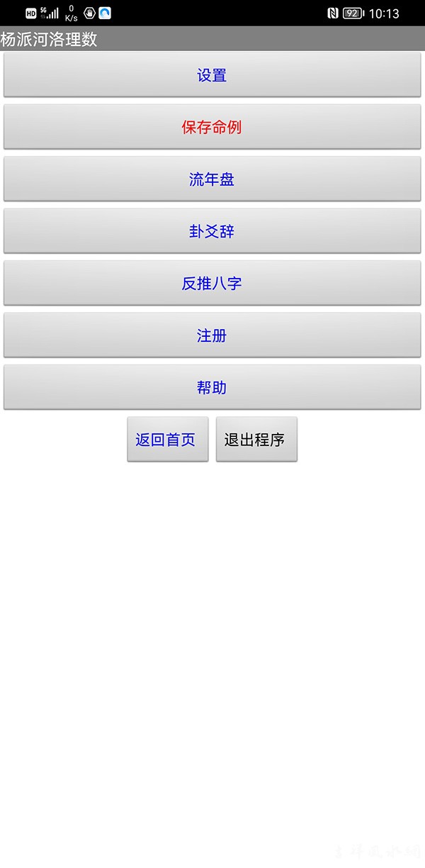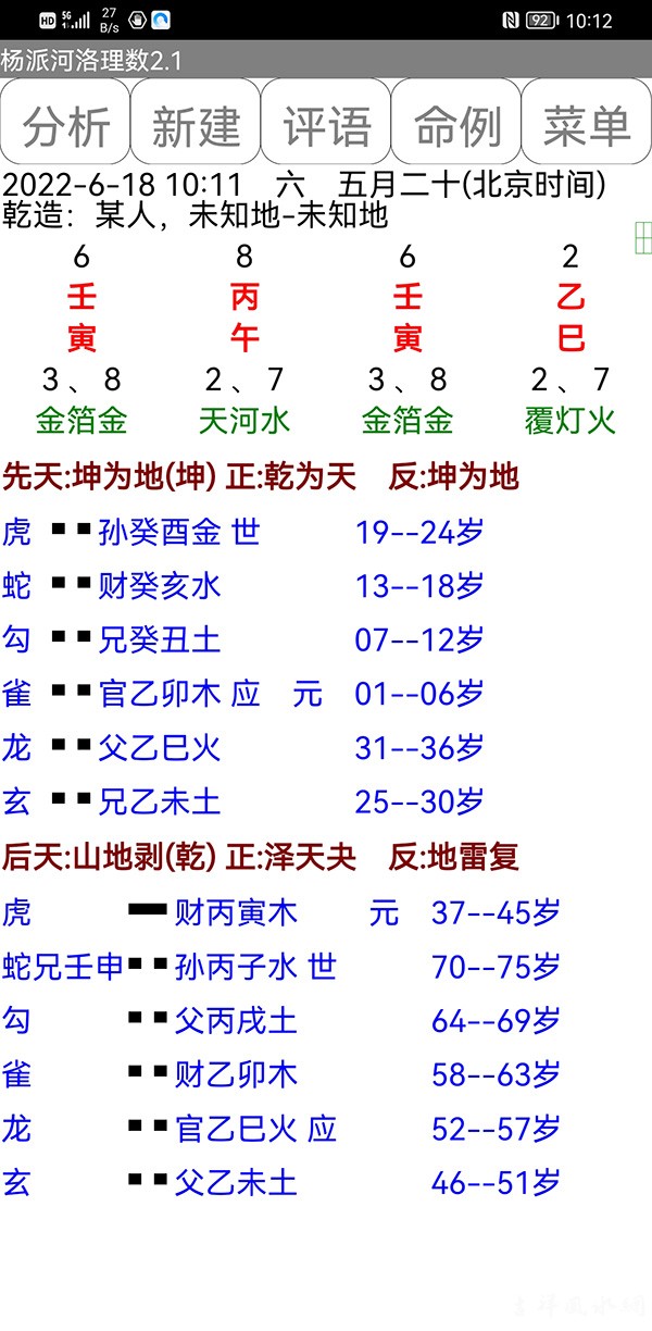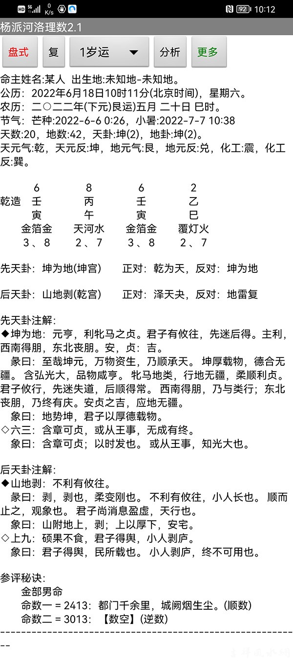 售价:150元 有需要者加微信gn413168 软件说明: 1:运行环境:安卓系统\鸿蒙系统 2:本软件为绿色软件,安装软件时只完成复制,卸载时直接删除,不会往你的系统文件夹拷入文件,不会 修改注册表,请放心使用,不带任何插件。 3:本软件为共享软件,未注册有功能限制,但没有时间限制。注册后你可以使用所有功能,并且享受软件 日后的免费升级,和使用时作者亲自提供的技术支持。 4:你可以分发、传播这个软件,但作者拥有对软件的所有权。请不要对它进行反汇编、破解,谢谢你的合 作。 ================================================================ ※ 杨派河洛理数 2.1正式版 ※(2022/06/18更新) 一:排盘: 1:在右边面板输入命主出生日期、出生地(如果软件设置使用真太阳,地点必须选择,反之不选也可)姓 名、性别。(主命生年支持公元前4713 到 9999年) 2:出生时间、公农历(如出生时间是农历,要勾选是否农历闰月)(时间支持公元前4713 到 9999年) 3:选择预测地点(如果在软件设置里面选择了“真太阳时”或者“地方时”,不同地点对四柱有影响。选 择北京时间,地点对四柱没有影响)。 4:点“本命盘”按钮,就可以看到河洛盘。 5:排出本命盘后,就可以排 流年盘了。输入流年时间(公历),点“流月流日”按钮,就可以在左下角 看 到流年盘信息。 ========软件设置会影响排盘,设置选项说明============= 一:日卦交节 1:计算到日,只算流日时间到节气间隔的日数,只算天数,没有计算时、分。 2:计算到时分,精确计算流日时间到节气间隔的日数,计算到时、分。 二:日卦计算 1:六日一变,交节开始,六天变一卦,首日初爻起。 2:五日一变,交节开始,五天一变卦,作为首日卦,接下来的日子,依次从下往上变。 三:时卦计算 1:按跹羰鼻?郑?词背降牟煌??映笠??剿任?羰保?渌??跏保?炙衬娌钾浴� 2:同流年流月法,日卦变时卦,方法同年卦变月卦,12个月看成12个时处理。 四:子时计算,有4种方式,针对23点 - 0点的子时特别处理,0点 到 1点的子时自然算入当日。 1:明日明时,日柱按第二日算,时柱按第二日子时算(时干随日遁)。(建议用此项) 2:明日今时,日柱按第二日算,时柱按今日子时算。 3:今日明时,日柱按今日算,时柱按明日子时算。 4:今日今时,日柱按今日算,时柱按今日子时算(时干随日遁)。 ======================================================================= ======================================================================= 二:历史记录管理 1:软件可以保存无限多的命例,并可以方便地查找、编辑、修改历史记录。 2:记录管理功能,可在软件左边的命例列表上查看右键菜单。 3:查看历史记录时,如果进行了修改,可以点击“布卦”按钮上方的“存旧”图标,保存修改后的文本 。 4:菜单“文件->导出历史记录”可以把当前所有历史记录另存到指定的目录,适用于软件升级时保存旧版 本的记录(导出的记录,可以在安装后的新版软件重新导入) 5:菜单“文件->导入历史记录”可以把导出的历史记录重新加入现在的软件,使用此功能,将先清除现有 的记录。(此功能可以把旧版本的软件的历史记录导入) 6:菜单“文件->整理记录文件”将优化现有记录文件,读取提高速度。 7:软件启动时,只显示最近保存的最多 1000个案例,如果要显示全部或者查找指定类别,可以按鼠标右 键 ,执行对应功能。 ======================================================== 参考书目:《河洛理数》、《河洛精蕴》、《河洛真数》、《实用河洛理数全集》等。 |