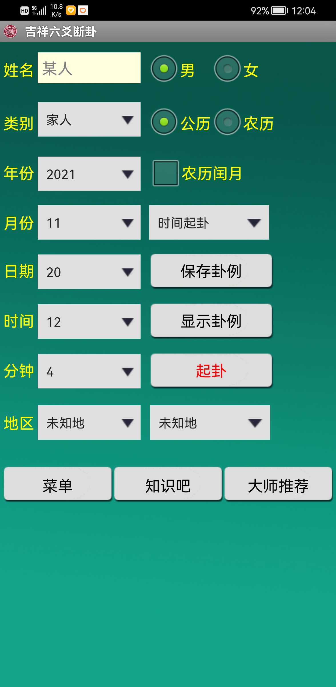 适用于安卓系统、鸿蒙系统使用 售价:268元 有需要者加微信gn413168 手机六爻断卦 V2.13 本软件是手机六爻断卦程序android版,android系统V4.0及以上版本手机和平板电脑、华为鸿蒙系统,都可以安装使用。 软件起卦方法有:时间起卦、数字起卦、手选起卦、铜钱起卦、分秒起卦、模拟起卦、随机起卦、起终身卦。断卦方法有“六爻断卦”、“梅花易数”。 无论按哪种方式起卦,先选定起卦时间,再选择起卦方式。选择好各个数据后,点击“起卦”按钮,会排出内容。在这个页面里,有“六爻断卦”和“梅花易数”两种断卦方式。 如果古式显示卦六爻卦线条对不整齐,则点击选项菜单里的“古式显示卦爻线条对齐调整”。 本程序浏览器显示内容字体大小可自行选择,背景颜色有三种选择,您可选择设定喜欢的字体和背景色。 您也可以在显示浏览器内容的页面,点击“保存(html)”按钮,保存内容为浏览器格式。点击“编辑分享内容”按钮,可将内容转成纯文本格式。再点击“分享”按钮,选择通过微信、微博等方式分享内容给好友。 程序首页“保存卦例”功能:程序会自动备份保存的卦例文件到“本地存储”nfdata/LiuyaoDuangua文件夹里。如果换手机,在不打开六爻断卦软件的前提下,先在“本地存储”里创建nfdata文件夹,再将整个LiuyaoDuangua文件夹复制到此路径里,这样就恢复了所有保存的卦例。 起卦年份介于1882-2060。 主卦各爻地支用不同颜色标出:旬空(红色)、月破(蓝色)、日冲(蓝色)、日合(绿色)。 点击“保存卦例”按钮,可保存当前排出的卦,最多可保存2000条卦例。 点击“显示卦例”按钮,可列出保存过的卦例。点击选择要排出卦例,再按此页面里“起卦”按钮,可排出此卦内容。按“删除卦例”可删除此条卦例。 示例 某人 地区:未知 北京时间:2021年11月20日12时4分 农历:2021年十月十六日午时 辛 己 壬 丙 日旬:甲子 丑 亥 申 午 日空:戌亥 日禄-亥 驿马-寅 桃花-酉 贵人-卯巳 卦身:戌 世身:三爻 雷火丰(坎宫) 泽火革(坎宫) 官鬼庚戌土、、 官鬼丁未土、、 白虎 父母庚申金X 世 父母丁酉金、 螣蛇 妻财庚午火、 兄弟丁亥水、 世勾陈 兄弟己亥水、 兄弟己亥水、 朱雀 官鬼己丑土、、应 官鬼己丑土、、 青龙 子孙己卯木、 子孙己卯木、 应玄武 起卦方式:时间起卦 雷火丰 ▅▅ ▅▅ ▅▅ ▅▅ ▅▅▅▅▅ ▅▅▅▅▅ ▅▅ ▅▅ ▅▅▅▅▅ 泽风大过 ▅▅ ▅▅ ▅▅▅▅▅ ▅▅▅▅▅ ▅▅▅▅▅ ▅▅▅▅▅ ▅▅ ▅▅ 泽火革 ▅▅ ▅▅ ▅▅▅▅▅ ▅▅▅▅▅ ▅▅▅▅▅ ▅▅ ▅▅ ▅▅▅▅▅ 伏神: 六爻 兄弟戊子水、、世 五爻 官鬼戊戌土、 四爻 父母戊申金、、 三爻 妻财戊午火、、应 二爻 官鬼戊辰土、 初爻 子孙戊寅木、、 焦氏易林:丰之革:魂孤无室,衔损不食。盗张氏馈,见敌失肉。 主卦数:4 + 3 = 7 主卦神煞: 六爻:空亡 五爻: 四爻: 三爻:空亡 二爻: 初爻:天乙 变卦神煞: 六爻: 五爻:咸池 四爻:空亡 三爻:空亡 二爻: 初爻:天乙 六爻断卦分析: 世爻化进神,吉。 螣蛇发动,主疾病、惊恐、怪异之事。 世爻临日辰生旺之地,吉。 卦变比和,大象吉。 世爻化进神,吉。 测来意: 父母爻动克子孙爻,子女有病。 官鬼爻落空亡又休囚,家里有是非、官司。 定应期: 世爻有气发动临日辰,以当日为应期。 世爻受制,可以忌神到位之年月日为应期,也可以克制忌神之年月日为应期。 问升学: 世应相生,考试成绩理想,可一举成名。 事业功名: 父母爻临世,若为官,必在富裕发达之地。 问婚姻: 世应相生,测结婚者婚姻易成。 应生世,女方贪财,容易答应婚事。 日辰临父母爻,婚期已定。 财爻休囚,女方是贫家之人,或妻子不得力。 财官休囚,婚姻不顺,本人身体瘦。 财克世,婚姻遭妒忌。 问子女: 子孙爻临月令生旺之地,吉。 子孙爻临日辰休囚之地,凶。 子孙爻受动爻克,凶。 子孙爻旺相化子孙,主双胞胎。 妻财爻临月日休囚之地,断临产主母亲不利。 子孙爻旺相,不空,无冲,主子女贤能有出息。 父母爻持世,不利子女。 问财运: 财爻不动,逢冲日可得。 父母爻动克子孙爻,不利求财,防亏本。 世应相生,利生意合作,同心协力。应生世,他益于我,生意容易成。 兄临朱雀,防口舌是非。 财爻衰变旺,物价必涨。 财爻衰,买卖宜缓买。 财爻安静,积货有利,出货不利。 父母爻持世,求财辛苦。 问行人: 卦中动爻、变爻、日月都无财爻出现,行人无路费返回。 用神无月日动爻冲者,行人没有回来打算。 父母爻动,行人有书信或电话回来。 问出行: 世爻动而化进神,吉。 世爻属金,喜坤艮方,忌离方。 妻财爻休囚,出门路费少。 世爻动而行期已定。 父母持世,路上不顺利,或为行李所累,或因风雨而阻。 间爻安静,往来安泰。 问官司争讼: 太岁临鬼,官司升级。 世爻动,我定计谋。 应变鬼,官司不小,麻烦大。 应生世,于我有利,吉。 父母爻衰,讼事无头绪,或讼状有破绽。 父母爻持世,我告他。 内外有官,事必两处或两处不管,主事经反复后结案。 兄弟在间爻,牵连证人多。 间爻克世生应,防证人同来害我。 兄化兄,打官司消耗很大。 官爻衰,罪轻。 太岁生世,得意外之助,或减刑。 问失物: 世应相生,东西没有丢失或可找到。 蛇临世爻,自己忘记。 卦有二鬼,为二人共同做案。 鬼与世爻相生,东西可能被亲戚朋友拿去。 小偷从东北方来,又去了东北方。 官鬼爻空,小偷难寻。 外卦财爻休囚,失物已去远