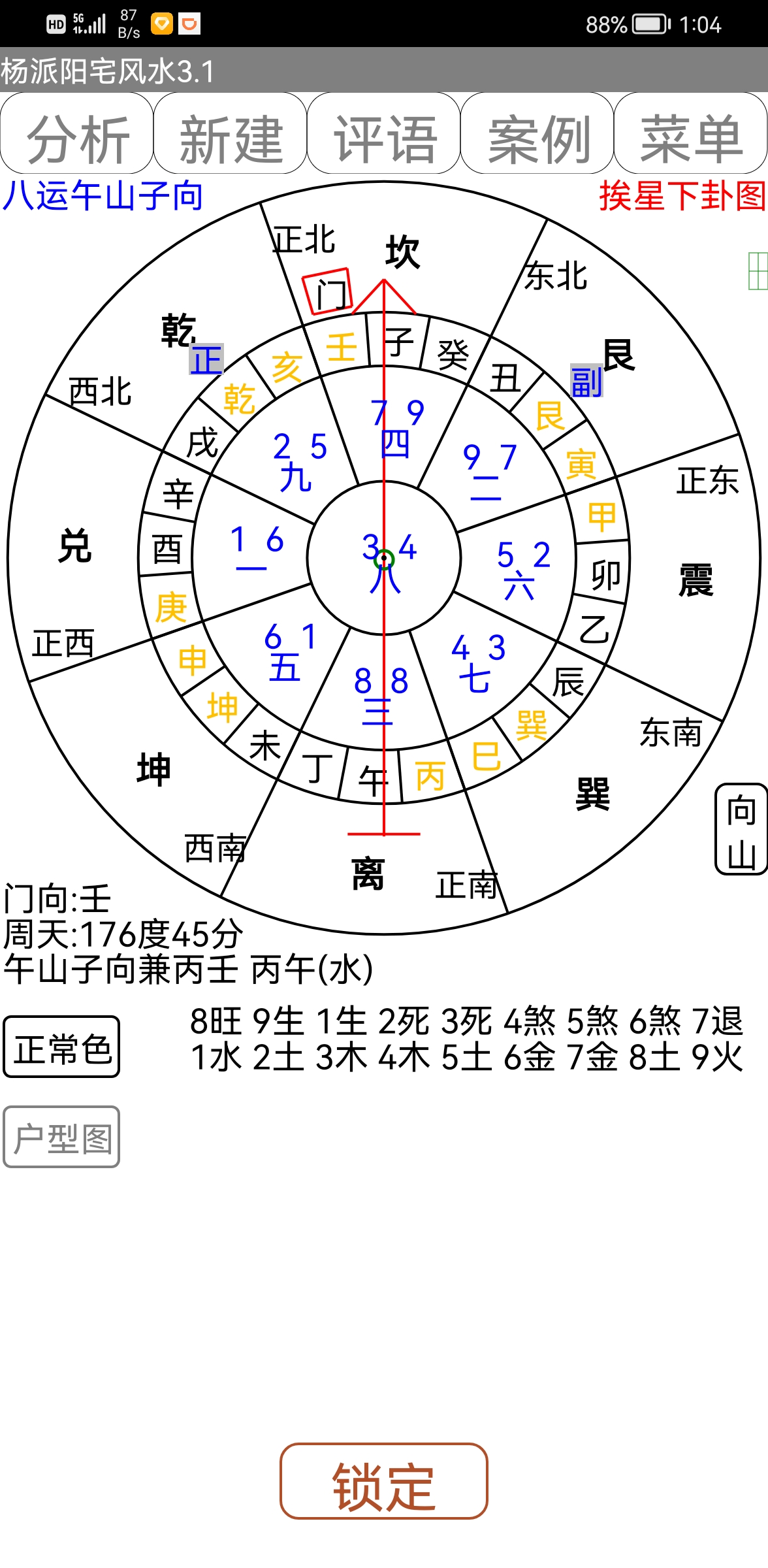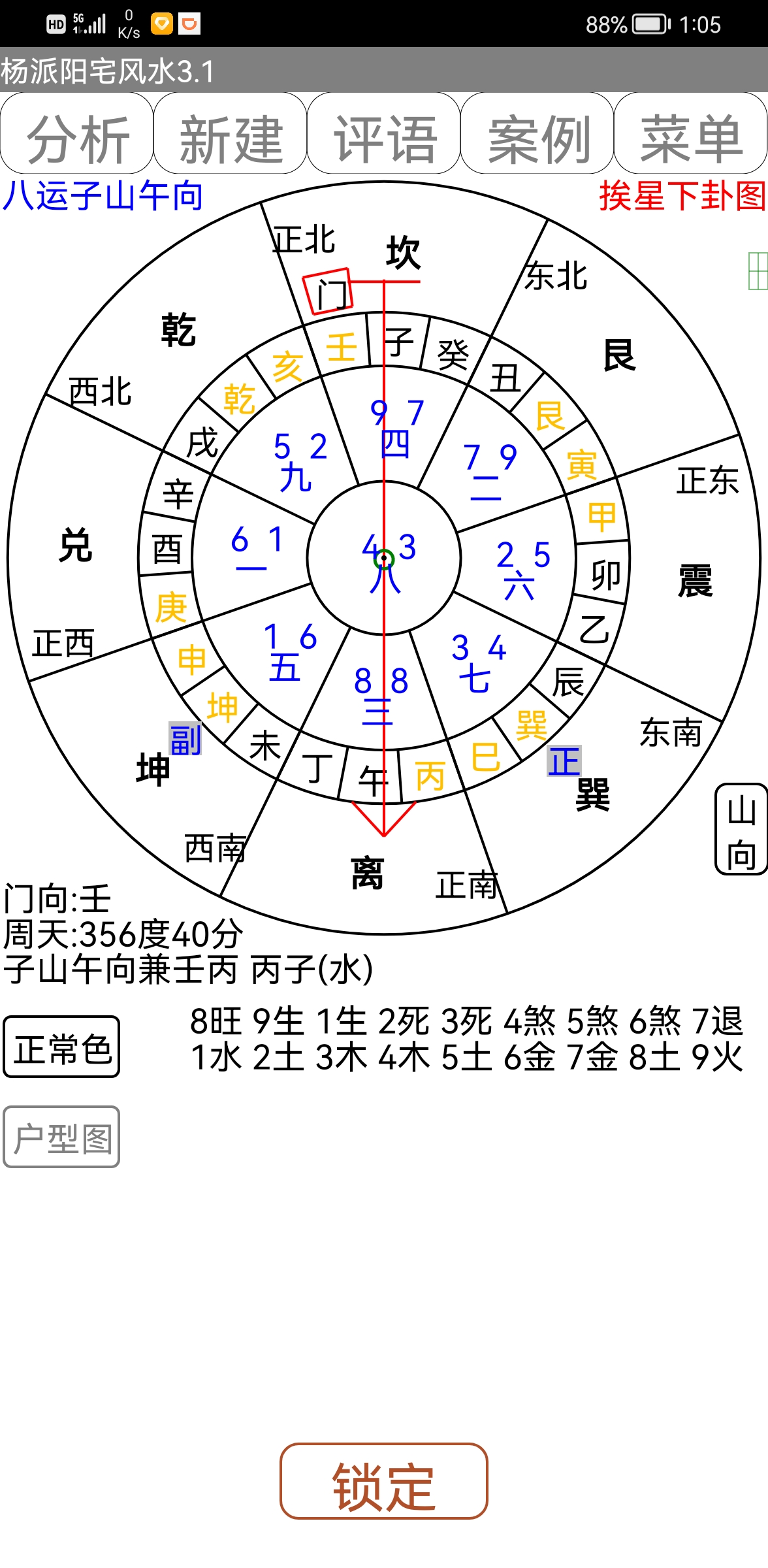 售价:150元 有需要者加微信gn413168 一:排盘 以下操作,在软件界面下方的输入面板上。 1:点“新建”,开始一个新的阳宅案例。 2:输入建宅年份,输入完毕,直接按回车键,下方会直接给出对应元运。也可以年份、元运分别输入,但 是不能矛盾。 3:选择房屋坐向,这个可以用罗盘测得。输入周天度,也可以在罗盘上读到。 4:玄空盘,可以选择下卦、替卦排法,一般是兼向用替卦,需要综合考虑,自己选定。 5:选择门向。 6:输入宅主生年,也可以点击上面的“人物按钮”,输入完整的生日(这样可以求得八字、具体的公农历 )。选择宅主性别。 7:输入姓名,保存按钮的时候识别用。 最后点“布宅局”按钮,软件通过运算,就可以给出图文并茂的参考信息了。 提示:玄空盘、八宅盘里的坐山线、24山圈都可以拖动旋转、图形大小可以拉伸。 ======================================================================== 二:导入户型图 1:点击“布宅局”右边的房子图标,选择户型图导入查看。 2:玄空盘、八宅盘里的坐山线、24山圈都可以拖动旋转、图形大小可以拉伸。宅盘上按鼠标,可以叠加到 户型图上面。 3:户型图上面按鼠标右键,有各种功能。 4:点击软件上面的菜单“辅助工具”可以编辑户型图上面的绘画工具,比如“直线、圆、方形、文字、笔 擦等等”,还可以设置画笔属性、文字属性等。 ============================================================================== 三:历史记录管理 1:软件可以保存无限多的命例,并可以方便地查找、编辑、修改历史记录。 2:记录管理功能,可在软件左边的命例列表上查看右键菜单。 3:查看历史记录时,如果进行了修改,可以点击“布卦”按钮上方的“存旧”图标,保存修改后的文本 4:软件启动时,只显示最近保存的最多 1000个案例,如果要显示全部或者查找指定类别,可以按鼠标右 键,执行对应功能。 示例 宅主:某人 乾造:戊午-巽宫(1978年,中元乾六运) 建宅年份:辛丑(2021年)八运艮宫。 坐向:午山子向(离宅),周天度-177:13(天天乾) 门向:壬方。 ---------------------------------------- 玄空法断宅: ★座山属天元龙大门宜开在天元龙方。 ★房屋朝向与门向不属于同一元,不吉利,可以考虑改门。 ●此为双星会坐的格局。旺丁、不旺财。如果背后有河流、池塘,再后面有山峰,前面开阔宽敞,有广大田野。就可以反凶为吉。 ★文昌位:坎,此方位适合读书人居住,有利于学业功名。 ★正城门:乾(八-旺),副城门:艮(五-煞)。 ★此步元运,八(旺),九(生),一(生),二(死),三(死),四(煞),五(煞),六(煞),七(退)。 挨星下卦: ◎八运-天元龙午山子向。 地运一百年。 五运旺山旺向。 三、七运全局合十。 二、四、七、九运坎宫打劫。 城门一、三、五运不用。六、九运乾艮吉。四、七运艮吉。二、八运乾吉。 ★八运,配星三到山、四到向。山星兰入中逆飞,向星四入中顺飞。犯上山。向卦克出凶,山卦比和吉。 ---------------------------------------- 【正南:离宫-丙午丁】 午山 ★山星8(旺),向星8(旺),运星3(死)。 ●此宫双星会坐。 ★山方主星[八白土星]八白又称左辅星,为吉星。当其旺,忠孝良义,富贵绵远,小房洪福。当其衰死,小口损伤,瘟疫腹胀。 ★山星-向星组合,主事:八八,比和。当其旺.大利文才学业,大岌田庄地产之富。双吉临门,事业兴旺;当其衰,业衰破财,常有肩骨酸痛之苦。 【正北:坎宫-壬子癸】 子向 ★山星7(退),向星9(生),运星4(煞)。 ●此宫双星会向。 ☆反吟:向星和地盘。 ★向方主星[九紫火星]九紫火为右弼星。当其旺.文章科第,骤至荣显,中房得贵。当其衰,回禄亨灾,吐血疯癫,目疾难产。 ★向星-山星组合,主事:九七:克出。当其旺,男女聪明灵利.横财就手。当其衰,男女花酒淫欲。家有回禄之灾:财产散尽,有成痨瘵,九七为先后天火。终有火灾、官灾之日。 【东北:艮宫-丑艮寅】 ★山星9(生),向星7(退),运星2(死)。 【正东:震宫-甲卯乙】 ★山星5(煞),向星2(死),运星6(煞)。 【东南:巽宫-辰巽巳】 ★山星4(煞),向星3(死),运星7(退)。 ★合十:向星和运星。 ☆伏吟:山星和地盘。 【西南:坤宫-未坤申】 ★山星6(煞),向星1(生),运星5(煞)。 【正西:兑宫-庚酉辛】 ★山星1(生),向星6(煞),运星1(生)。 ☆伏吟:山星和运星。 【西北:乾宫-戌乾亥】 ★山星2(死),向星5(煞),运星9(生)。 【中心:中宫-戊己】 ★山星3(死),向星4(煞),运星8(旺)。 建宅选择: ◎(辛丑)建宅,当年飞星六白入中。 地盘太岁:丑,飞星太岁:兑。 年三煞:寅、卯、辰。 ●以上太岁、三煞所临和对冲之方,不宜坐山立向和修造。 -------------------------------------------- 玄空山运断: [阴宅]本山向:八白令星会合坐山,有聚水、三叉、高山、峻岭者,当元丁财大发,并产文士,忠厚可钦。向首九紫生气,有小水为吉,有案山者,凶祸立至。 坤宫之玄之水,蛐惴逭撸?⒏S凭茫?氖砍氏椤6夜?岷舷嗤??┤∩椒逦?稀� 乾、巽、震、艮诸宫,见形见气,则凶祸连绵,宅主、孕妇外症、腹疾不止。 命宫有一六八者为吉。流年添丁,以午未酉年为旺,子年亦吉,戌亥卯巳年主凶。 [阳宅]宅外山水用神,与阴宅同。内门、房门、灶门,开在离宫者,丁财勃发,在坤宫者,贵子连生,欲求富贵功名,舍此没由;乾、震、巽宫均吉。 [造葬]本山无行属火,合局与丙壬同。亥年为太岁,子年为七煞,申子辰年月为坐煞,寅午戌年月为向煞。五黄与丙壬同。惟巳酉丑、亥卯未年大通。 钟注:坐山之天盘三碧木生元旦