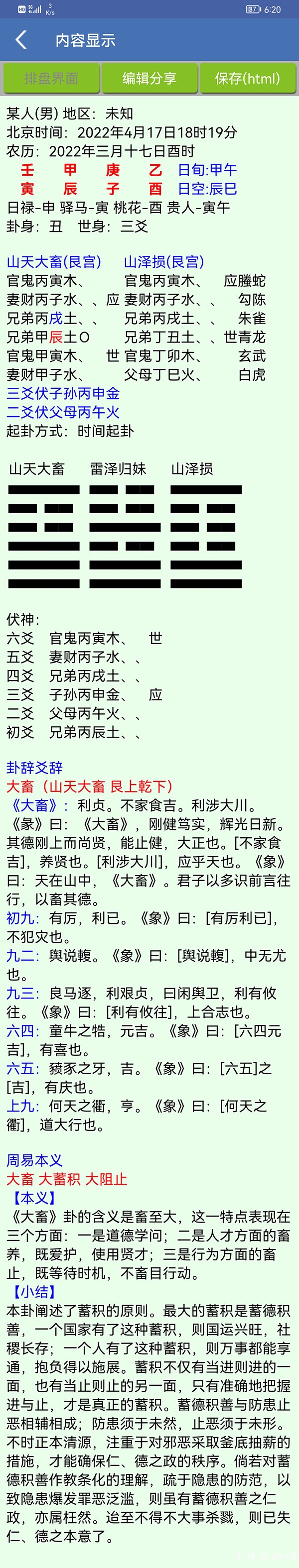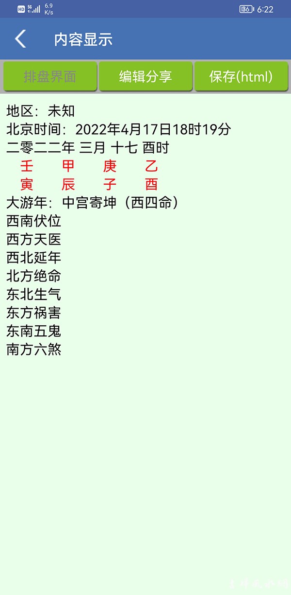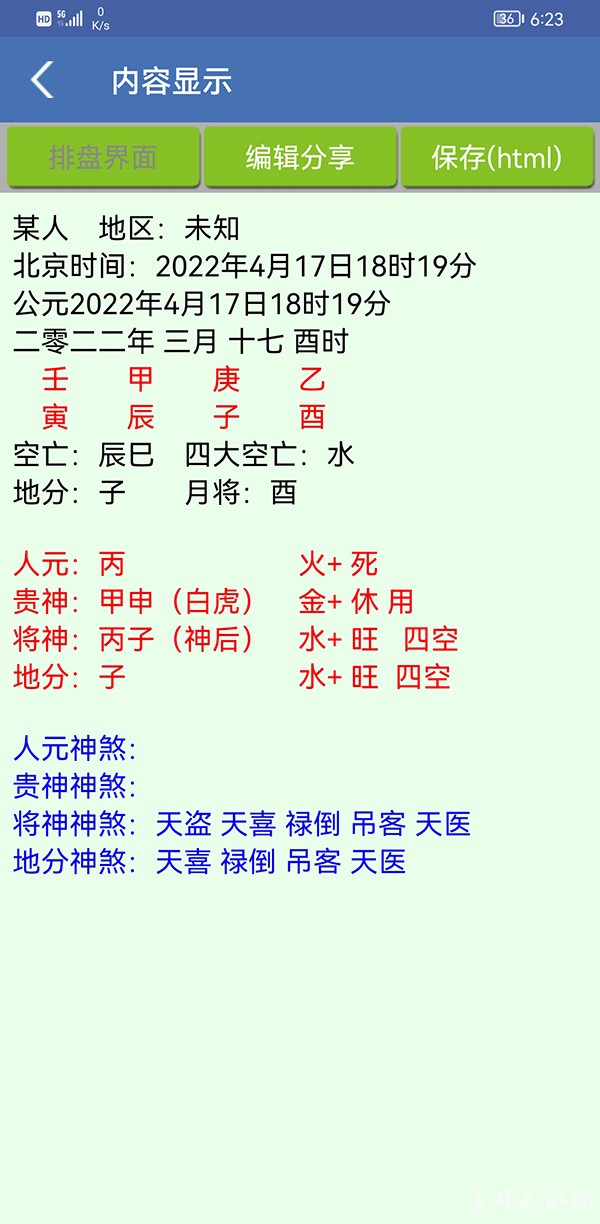 适用于安卓系统、鸿蒙系统使用 售价:368元 有需要者加微信gn413168 本程序包含八字排盘、六爻起卦、玄空风水、六壬金口诀、奇门遁甲等几部分内容。 1、八字排盘内容有八字、大运、起运岁数、四柱神煞、大运神煞、命宫、胎元、岁运并临。称骨算命、重大关口、串宫压运、终身卦、80年小运、大运流年干支、流年神煞等内容。 2、六爻起卦有八种起卦方法,分别是“数字起卦”、“时间起卦”、“手选起卦”、“铜钱起卦”、“分秒起卦”、“模拟起卦”、“随机起卦”、“起终身卦”。 3、玄空风水内容有:年月日时飞星盘、二十四山图、八宅派大游年等。 4、六壬金口诀起课内容有:人元、贵神、将神、地分、空亡、四大空亡、课内神煞、课内旺衰等。 5、奇门遁甲内容有:时家奇门、日家奇门排局。 每次点击“排八字”按钮后,程序会自动保存八字内容到zhpp_PaiBazi.html文件,此文件位于您手机存储卡nfdata文件夹里。您可以重命名此文件。这是浏览器格式文件,您可将此文件拷贝到电脑里,用IE等浏览器打开,然后可将内容拷贝到WORD等编辑器里编辑。 六爻起卦的文件名是zhpp_Liuyao.html,金口诀的文件名是zhpp_Jinkoujue.html,奇门遁甲的文件名是zhpp_Qimen.html。 八字排盘、六爻起卦、六壬金口诀、奇门遁甲几种排盘起局可以保存命例、卦例、课例等。“奇门遁甲”保存时间奇门示例。 |