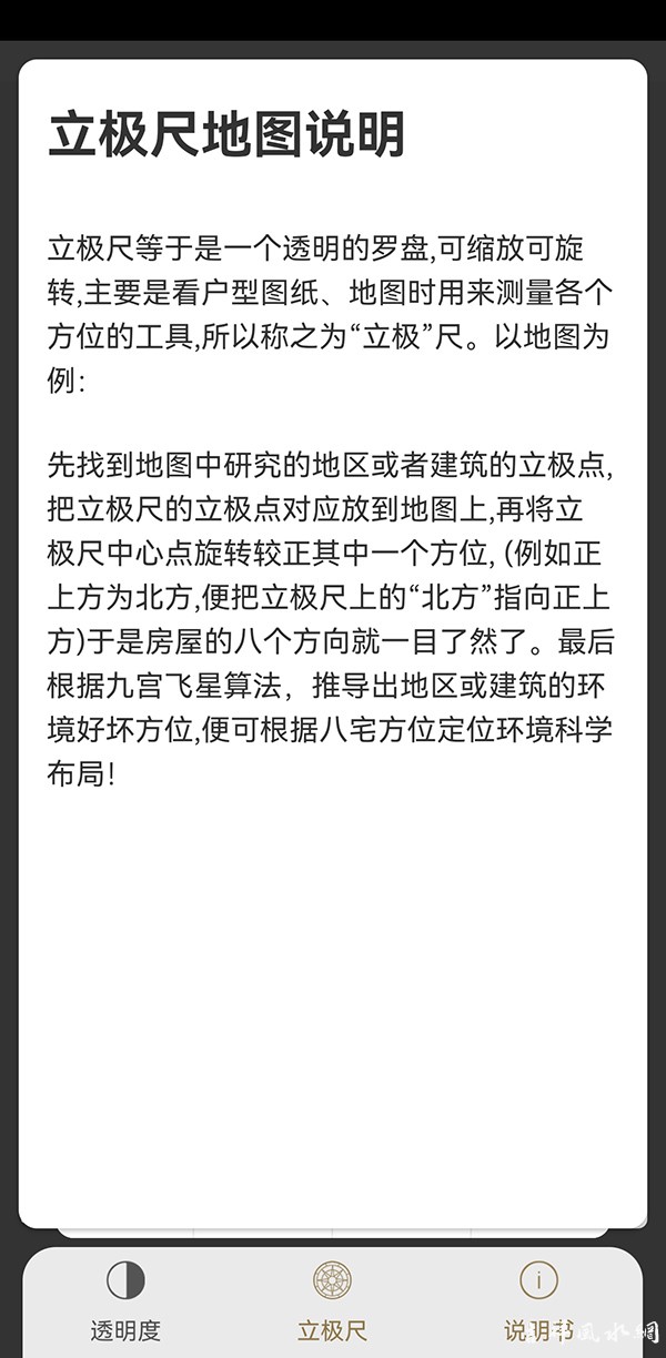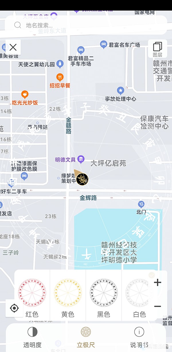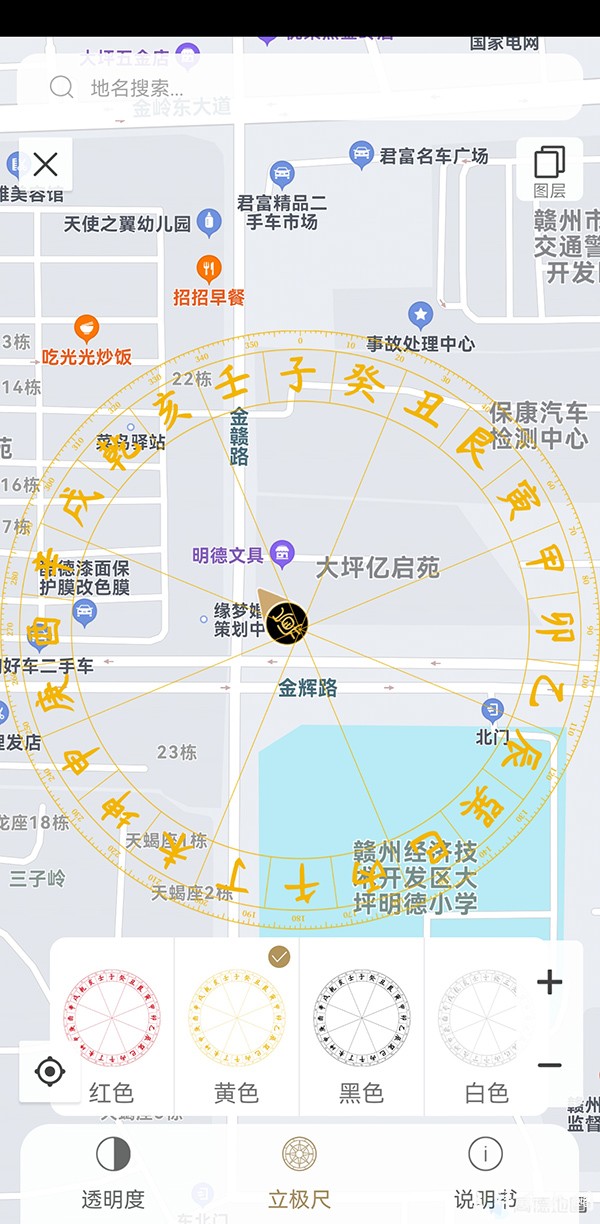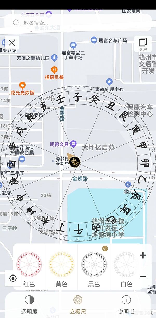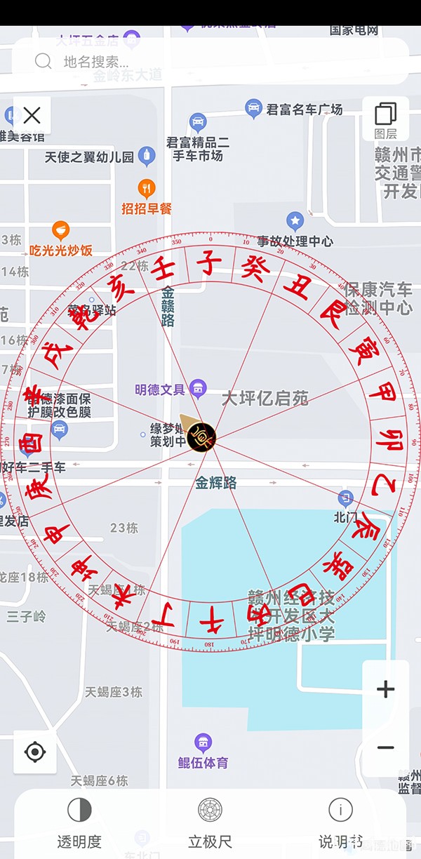 安卓版多功能手机软件:内有三合罗盘,三元罗盘,综合罗盘,卫星地图套罗盘,立极尺等功能。立极尺软件二十四山罗盘套户型图。点立极尺,点地图模式出,点一下图层就是卫星地图,再点一次就是一般地图,如果出不来卫 ...