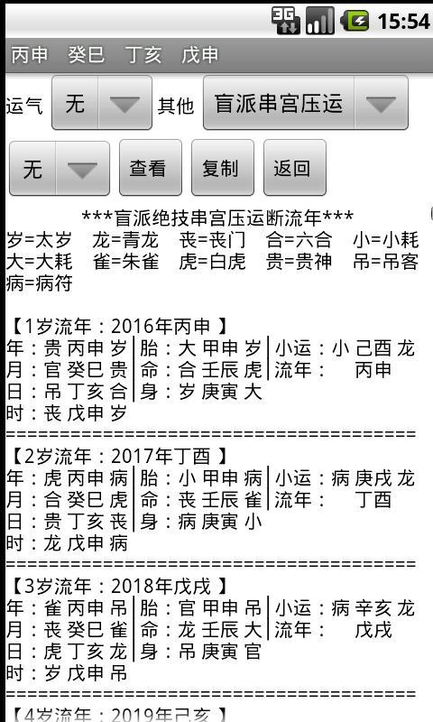 售价:186元 有需要者加微信gn14319 ※八字安卓版 最新版本 7.2 运行环境:Android 系统 开发工具:Eclipse 软件介绍: 专业的八字算命软件,可根据人的出生时间推算命运,原理来自我国古老的易经文化。所有的命理参数都可求得。特有的“运势曲线图”让你把握每一年的运程,详尽的分类预测,解释人生的方方面面。 1:推算范围在-4713年到公元9999年,节气时间采用万年历数据,确保求得正确的八字 2:软件自身具有一定的智能分析功能,对日主的旺衰、命局的五行生克制化都能给出恰当的评价,考虑了专旺、各种从格、化气、半壁、两神成象等特殊变格。 3:对人生的每一年流年运气都给出详细的评价,还有曲线图示,即使不懂八字的人也能看出自己当年的运气。 4:流日运势,显示一个月内每日的运气、体力、智力、情绪的百分数,直观的了解每日自己的状态。 5:详尽的分类预测,可以推测个人性格特征、职业财运、祖业遗产、体质健康、学业、名气、官运、婚姻、家庭子女、兄弟姐妹等等。 6:内有一些通俗易懂的民间预测方法,如:年月日时断命、小儿关煞等。 7:具有从八字反推出生时间的功能。 8:良好的设置功能,可以设定八字重量是以农历还是干支来定月份;设定是否使用变格的喜用神取法;等其他一些选项。 9:带有两个八字量化分析工具,李氏四柱量化、其他四柱量化。 10:完善的命例管理功能,可以无限制保存命例,快速查找命例。 安装使用问题: 1:把“BaZi”这个文件拷贝到手机储存卡上,然后运行手机里的“文件浏览器”找到传过去的文件,点击运行,就可以开始安装了。 提示:如果无法安装,请先把“设置->应用程序”里面的“未知来源”勾上。 2:使用一些手机助手类的软件,按提示操作即可。 最新升级改进: 1:大运步数增加到十步,流年运气延长了20年,可以在软件设置里调整,可以设定8、9、10步运。 2:增加身宫显示。 3:六十甲子纳音名称修订。 4:出生地选择:市县名按拼音顺序排列,方便查找。 5 :增加盲派绝技-串宫压运断流年排盘。 6:八字盘增加第二种排法。 |