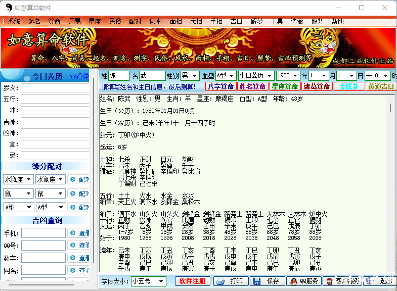 售价:100元 适用于电脑windows系统winxp/win7/win8/win11 有需要者加微信gn413168 〖如意算命软件〗是集八字算命软件、姓名算命软件、周易算命软件、星座算命软件、风水算命软件、面相手相软件、黄道吉日软件、周公解梦软件、测字算命软件于一体的综合算命软件。具有算命行业ERP之称。具体功能如下: 八字算命方面:八字详批、生日论命、袁天罡称骨论命、日干论命、三世财运、性格分析、感情婚姻分析、事业功名分析、财运分析、健康远分析、八字五行分析、三命通会论命、年月日时论命、属相论命、测字论命、指纹算命、血型算命等等。 姓名算命方面:对天格、人格、地格、总格、外格进行基业、家庭、健康等方面详细分析;按总论、性格、意志、事业、家庭、婚姻、子女、社交、精神、财运、健康、老运等进行详细分析;三才数理分析、对基础运的影响、对成功运的影响、对人际关系的影响、对性格的影响、五格数理暗示、总评及建议、系统综合评分。起名原理、起名大全、姓氏起源、起名常用汉字繁体字、姓名与命运、姓名与性格、五行与数字、五格剖象法、数理暗示因素、天人地格三才配置等等。 周易预测方面:四柱八字排盘、六壬起课、六爻起卦、奇门遁甲术、玄空飞星排盘、金口诀排盘、紫微斗数排盘、梅花易数、太乙神数、诸葛神数 、周易全书等等。 星座算命方面:星座详批、本年云程、属性运程、星座运程、情商解析、星座实力、星座名人、身体保健、五大建议、星座缺陷、星座缘分等等。 民俗预测方面:眼型占卜、面热占卜、心惊占卜、犬吠占卜、眼跳占卜、耳热占卜、耳命占卜、手相占卜、土地圣杯、拜佛求签、婚姻占卜等等。 风水方面:风水常识、风水对爱情的影响、新年招财、桃花盛开制胜秘笈、家居风水与姻缘、十二星座卧室桃花运大揭密、家居风水开运方法、财神该如何摆放、随意改房对风水影响、装修颜色与风水吉凶、客厅招财布局、九种最常见风水煞气及解救方法、除夕家居风水摆设与新年运、6种类型的住宅学会驱邪避凶、居家好风水的15件宝贝等等。 相学功能:对面型、额形、眉形、下颚、耳形、鼻形、眼形、嘴唇进行详细分析,按桃花面相、财运面相、职场面相、面相吉凶、开运面相、常见面相、爱情面相图解、职场面相图解进行归类分析,面相十二宫部位解密图、面相小人图、麻衣神相十二宫解释、旺夫运最强的女人面相图、最得宠的女人面相特点、10种手相透析你婚姻等。十二星座幸运痣、脚上痣、手腕间痣、三痣相连、胸口痣、手心痣、痣相全身分析,十大幸运痣、痣位与富贵命、额头凶痣化解方法、痣相揭露男人性欲、痣相揭露女人性欲、痣相与旺妻好男人、痣相与旺夫老婆相、痣相与财富运、痣相与有福女、男女面痣图等。另外还有手相部分等等。 其他方面:黄道吉日、周公解梦、缘分配对、星座配对、血型配对、生肖配对、婚姻配对、QQ配对、手机号码吉凶测算、QQ号码测算、网名测算、生男生女查看、万年历、姓名与八字基础知识、面相学、吉祥物、造命诗歌鉴赏等. 软件特色: 1、软件提供信息最为丰富,通俗易懂。是目前同类软件中信息最丰富的软件之一。 2、本软件参考了八字、姓名学、周易、民间预测、风水、相学、折吉、周公解梦等多中书籍,测算结果有根有据。 3、软件支持打印和测算保存。 4、软件界面美观,操作方便。 示例 姓名:陈武 性别:男 生肖:羊 星座:摩羯座 血型:A型 年龄:43岁 生日(公历):1980年01月01日0点 生日(农历):己未(羊年)十一月十四子时 胎元:丁卯(炉中火) 起运:8岁 十神:七杀 正财 日元 劫财 八字:己未 丙子 癸酉 壬子 遁藏:乙食神 癸比肩 辛偏印 癸比肩 己七杀 辛偏印 丁偏财 己七杀 五行:土土 火水 水金 水水 纳音:天上火 洞下水 剑锋金 桑松木 纳音:洞下水 山头火 山头火 剑锋金 剑锋金 路旁土 路旁土 大林木 大林木 炉中火 十神:正财 食神 伤官 比肩 劫财 偏印 正印 七杀 正官 偏财 大运:丙子 乙亥 甲戌 癸酉 壬申 辛未 庚午 己巳 戊辰 丁卯 1-7岁 8岁 18岁 28岁 38岁 48岁 58岁 68岁 78岁 88岁 始于:1980 1988 1998 2008 2018 2028 2038 2048 2058 2068 流年:己未 丁卯 丁丑 丁亥 丁酉 丁未 丁巳 丁卯 丁丑 丁亥 庚申 戊辰 戊寅 戊子 戊戌 戊申 戊午 戊辰 戊寅 戊子 辛酉 己巳 己卯 己丑 己亥 己酉 己未 己巳 己卯 己丑 壬戌 庚午 庚辰 庚寅 庚子 庚戌 庚申 庚午 庚辰 庚寅 癸亥 辛未 辛巳 辛卯 辛丑 辛亥 辛酉 辛未 辛巳 辛卯 甲子 壬申 壬午 壬辰 壬寅 壬子 壬戌 壬申 壬午 壬辰 乙丑 癸酉 癸未 癸巳 癸卯 癸丑 癸亥 癸酉 癸未 癸巳 丙寅 甲戌 甲申 甲午 甲辰 甲寅 甲子 甲戌 甲申 甲午 乙亥 乙酉 乙未 乙巳 乙卯 乙丑 乙亥 乙酉 乙未 丙子 丙戌 丙申 丙午 丙辰 丙寅 丙子 丙戌 丙申 四柱神煞: 年柱:太极贵人 华盖 披麻 月柱:天乙贵人 元辰 咸池 禄神 丧门 阴阳差错 日柱:文昌贵人 学堂 灾煞 吊客 将星 金神 时柱:天乙贵人 元辰 咸池 月德贵人 禄神 丧门 小运:壬子 乙丑 乙卯 乙巳 乙未 乙酉 乙亥 乙丑 乙卯 乙巳 00岁 08岁 18岁 28岁 38岁 48岁 58岁 68岁 78岁 88岁 辛亥 甲子 甲寅 甲辰 甲午 甲申 甲戌 甲子 甲寅 甲辰 01岁 09岁 19岁 29岁 39岁 49岁 59岁 69岁 79岁 89岁 庚戌 癸亥 癸丑 癸卯 癸巳 癸未 癸酉 癸亥 癸丑 癸卯 02岁 10岁 20岁 30岁 40岁 50岁 60岁 70岁 80岁 90