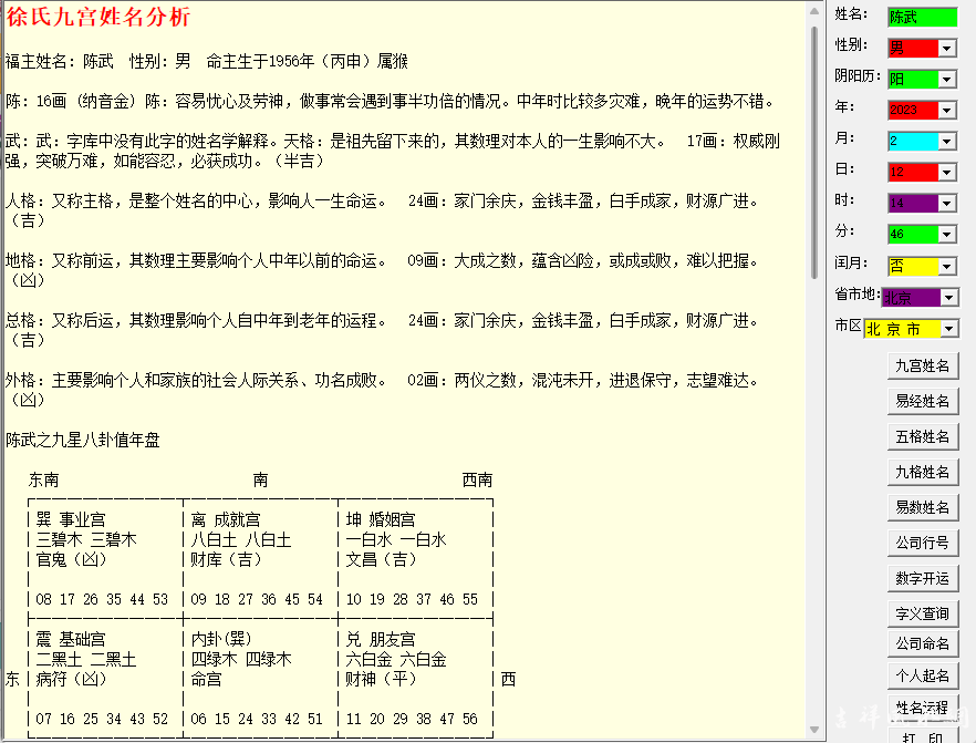 本程序的最大特点就是不像其它的起名测名软件只考虑五格数理的吉凶,只针对五格数理进行起名测名!本人认为一个名字对命运作用力的大小,五格数理所占比重较小,主要的是看名字能否补命局五行之不足。以命主生命用神的后天补救为重点,结合五格数理的轻重缓急,五格搭配是否顺畅,三才搭配是否通畅,生肖的和合,易经八卦,名字的姓名学字义,字形等多方面对所有的组合进行起名测名才是最专业。 示例 徐氏九宫姓名分析 福主姓名: 陈武 性别: 男 命主生于1956年(丙申)属猴 陈: 16画 (纳音金) 陈:容易忧心及劳神,做事常会遇到事半功倍的情况。中年时比较多灾难,晚年的运势不错。 武: 武:字库中没有此字的姓名学解释。天格:是祖先留下来的,其数理对本人的一生影响不大。 17画:权威刚强,突破万难,如能容忍,必获成功。(半吉) 人格:又称主格,是整个姓名的中心,影响人一生命运。 24画:家门余庆,金钱丰盈,白手成家,财源广进。(吉) 地格:又称前运,其数理主要影响个人中年以前的命运。 09画:大成之数,蕴含凶险,或成或败,难以把握。(凶) 总格:又称后运,其数理影响个人自中年到老年的运程。 24画:家门余庆,金钱丰盈,白手成家,财源广进。(吉) 外格:主要影响个人和家族的社会人际关系、功名成败。 02画:两仪之数,混沌未开,进退保守,志望难达。(凶) 陈武之九星八卦值年盘 东南 南 西南 ┌─────────┬─────────┬─────────┐ │巽 事业宫 │离 成就宫 │坤 婚姻宫 │ │三碧木 三碧木 │八白土 八白土 │一白水 一白水 │ │官鬼(凶) │财库(吉) │文昌(吉) │ │ │ │ │ │08 17 26 35 44 53 │09 18 27 36 45 54 │10 19 28 37 46 55 │ ├─────────┼─────────┼─────────┤ │震 基础宫 │内卦(巽) │兑 朋友宫 │ │二黑土 二黑土 │四绿木 四绿木 │六白金 六白金 │ 东│病符(凶) │命宫 │财神(平) │西 │ │ │ │ │07 16 25 34 43 52 │06 15 24 33 42 51 │11 20 29 38 47 56 │ ├─────────┼─────────┼─────────┤ │艮 子女宫 │坎 宅地宫 │乾 健康宫 │ │七赤金 七赤金 │九紫火 九紫火 │五黄土 五黄土 │ │口舌(凶) │红鸾(吉) │五鬼(凶) │ │ │ │ │ │14 23 32 41 50 59 │13 22 31 40 49 58 │12 21 30 39 48 57 │ └─────────┴─────────┴─────────┘ 东北 北 西北 姓名分析: 金性弱衰之人,心地光明,性虽有义,行事则有始无终,顾虑太多终难成事。金性弱衰被火所克会有刀伤流血之意外。女命弱金更应防产厄,怀孕时应特别小心。 本性属金的人在健康上应注意心肝功能,和呼吸道之疾病。利在西南、东北,西方次之。桃花在北方。黄色、白色为吉色,红色、绿色为忌色。 流年卦象:泽山咸 卦象:吉。正常之规矩方为吉象。 神杀:西北方犯冲,不可近丧家。 运势:诸事如意吉祥,但不可迷恋或冲动。 愿望:可以达成。 婚姻:顺遂之良缘,大吉利。 恋情:可成功,但切勿意气用事。 家运:家庭和乐,但不可脱离常轨。 周转:得利成功。 疾病:小心看护,于病情有利。 寻人:因感情迷失而出走,不久自己会回来。 失物:在东北方或西南方可以找到。 旅行:吉利。 纠纷:冷静和解则吉,冲动则凶。 事业:顺遂如意。 考试:努力可以看见成果。 改行:吉利,可依计划行事。 流年运程:2023年(癸卯)流年七赤金星飞临艮八宫:为宫去生星,为泄气星,流年不佳。主对外拓展,富幻想,不著实际的行动年。金来化土,这是不错的飞星组合;环境的转变,带来了可资发挥的环境,宜知机迎祥之矣。庚酉辛逢丑艮寅,庚贵于丑,辛贵于寅,显示出千里马之能迈百乐,原来的经营,能与新环境相成相应,善以把握,必能有理想的收获;必须注意的是,不适宜投机赌博,以免徒招破败;其次,容易发生口舌是非,以及皮肤之疾。注意感情事端,少女来就少男,容易沉缅感情而为情所害矣。 流月运程: 正月72相会:流月二黑飞临命宫,多主不利,作事难遂,同时应多加注意火灾。 二月71相会:流月一白飞临命宫,为泄气,虽无大凶,但也不吉。 三月79相会:流月九紫飞临命宫,为克入进气,大吉。 四月78相会:流月八白飞临命宫,生涯旺盛而得利。 五月77相会:流月金比和,命宫吉利。 六月76相会:流月七六同宫,交剑煞,劫掠、失窃、小人暗算、桃色纠纷、车祸。得时,通融有情、武贵掌权。 七月75相会:流月五黄飞临命宫,多主生涯顺遂。但多注意家中女儿身体健康。 八月74相会:流月命宫克出为耗气,不吉之象。 九月73相会:流月三七同宫,主窃盗、强盗、诉讼、官非之事。财多被盗。 十月72相会:流月二黑飞临命宫,多主不利,作事难遂,同时应多加注意火灾。 十一月71相会:流月一白飞临命宫,为泄气,虽无大凶,但也不吉。 十二月79相会:流月九紫飞临命宫,为克入进气,大吉。 催旺布局: 艮卦位(东北方)请放置一枚葫芦,可化解其凶性能量。 声明:以上姓名预测信息,仅供人生参考! 徐氏易经姓名分析 姓名分析:陈武 陈 16 乾格和数24 乾格配数 武 08 ------------------------------ 总格24 武:字库中没有此字的姓名学解释。 乾格和数 024(中中·平):美红颜,休挂怀。人在车中,舟行海底。注:妆扮自己,自我执着,兴高采烈,不要惦记怀念往事。只顾贪图目前享受,前途却已日暮穷途,毫无转机。 总格划数 024(中中·平):美红颜,休挂怀。人在车中,舟行海
