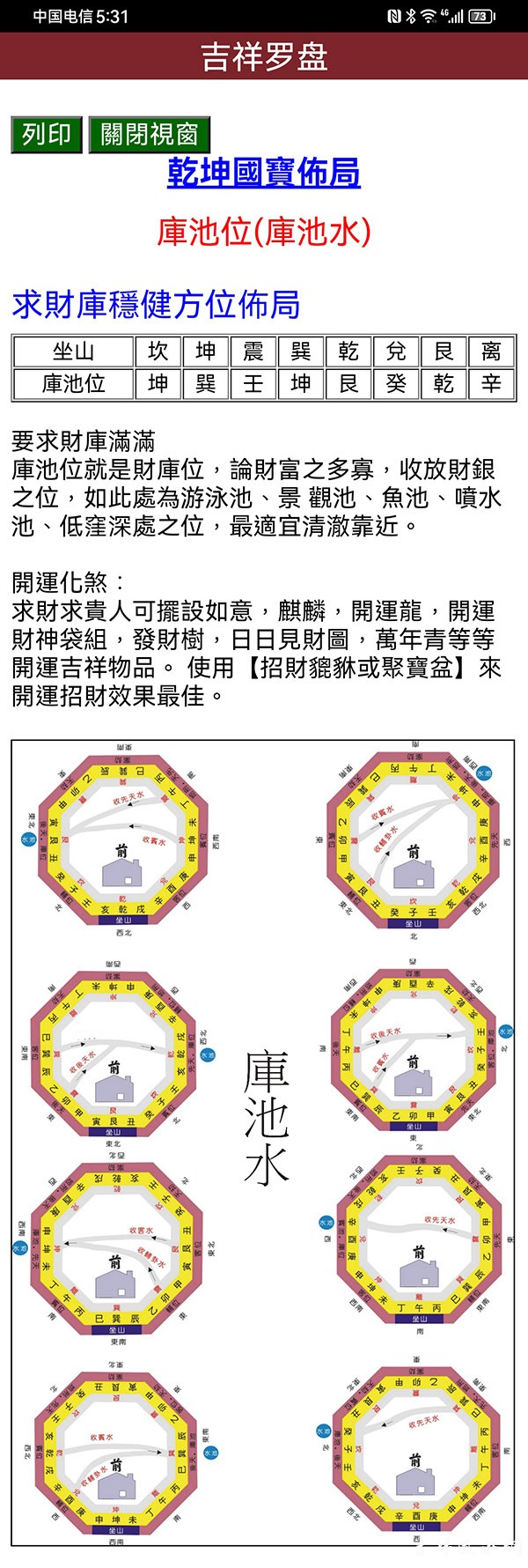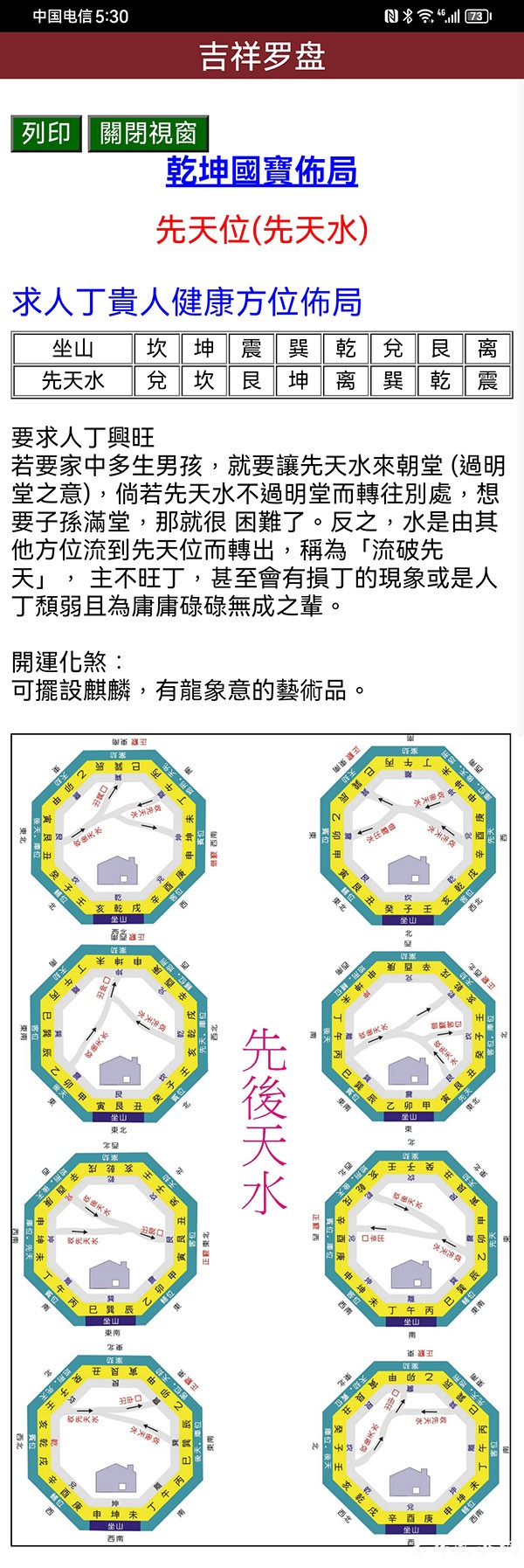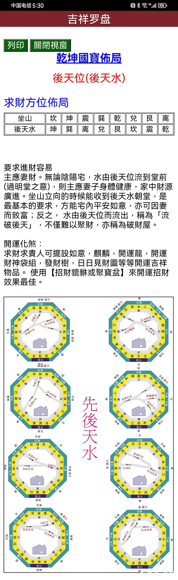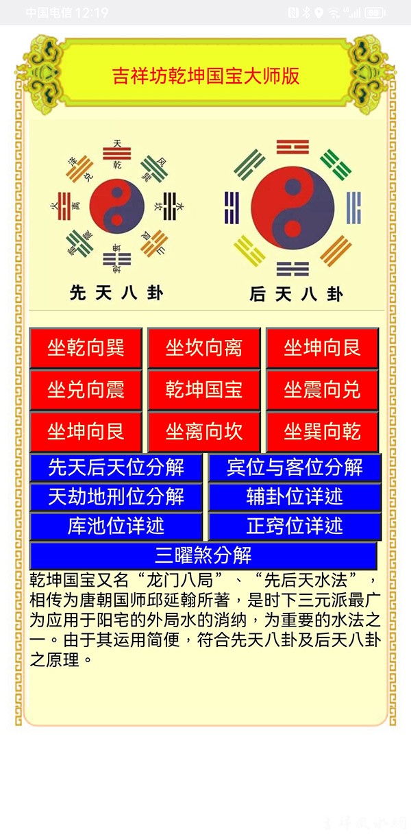 乾坤国宝又名“龙门八局”、“先后天水法”,相传为唐朝国师邱延翰所著,是时下三元派最广为应用于阳宅的外局水的消纳,为重要的水法之一。由于其运用简便,符合先天八卦及后天八卦之原理。 ... ...