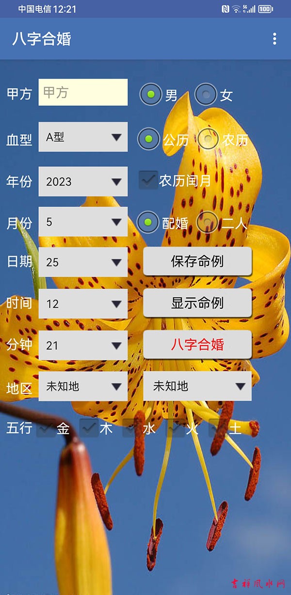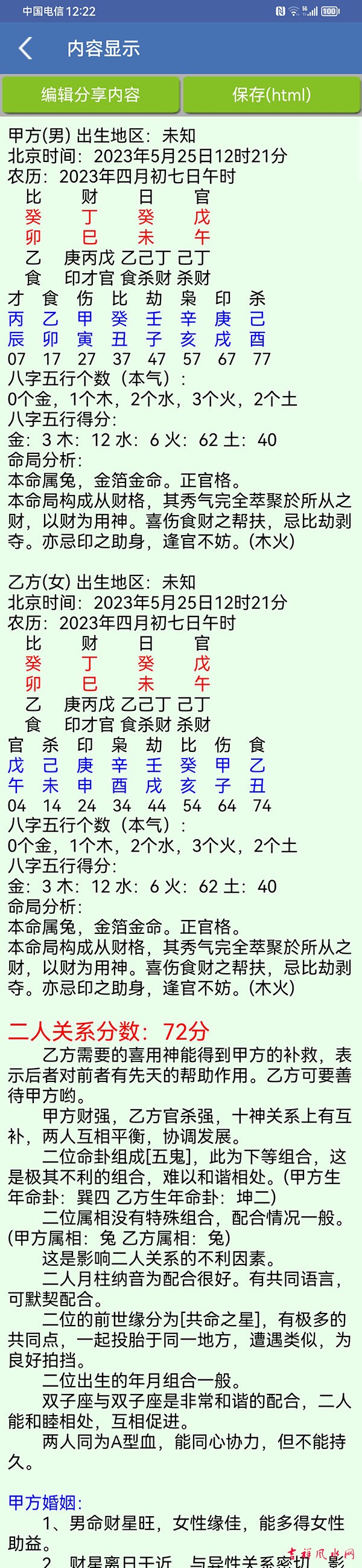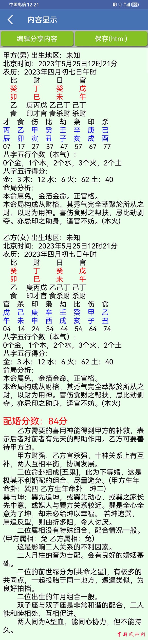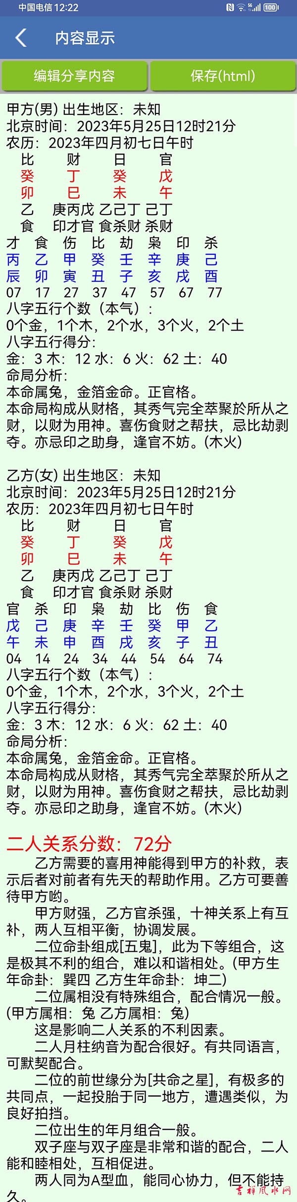 本软件注册费:6年期300元,3年期200元 ,2年期150元,终身版500元 本软件适用于安卓系统、华为鸿蒙系统。 有需要者加微信gn413168 本软件可以处理两个八字的“配婚关系”、“二人关系”。当然,“配婚关系”只适用于异性,“二人关系”包括同性和异性。可通过点击程序首页的“配婚”和“二人”选择测试何种关系。 五行选项是手工定喜用神,如果您不选择,则由程序来判断;如选择了,程序按您的选择运算。 程序处理两个八字的参考因素有:八字五行补救、十神配合、东西四命互配、生肖及四柱刑冲合害、四柱纳音配合、前世因缘(由出生时间算出对应的星宿,再有星宿配合论命)、二人出生年月之配合、星座、血型。 综合以上因素来评分,100分为满分。大于80分者为上等婚,60-80分之间者为中等婚,小于60分者为下等婚。 当然,命理的因素也仅仅是个参考因素,良好美满的婚姻还是要靠每个人努力去经营的。常存善念,不断改正自己的错误,宽宏大量,尊重他人,长此以往,命运自然会改变,婚姻也自然会美满。 在显示八字合婚内容页面里,点击手机“MENU”按钮,会弹出菜单,分别有“造命篇”、“八字知识”等内容。" 每次点击“八字合婚”按钮后,程序会自动保存合婚内容到BaziHehun.html文件,此文件位于您手机存储卡nfdata文件夹里。您可以重命名此文件。这是浏览器格式文件,您可将此文件拷贝到电脑里,用IE等浏览器打开,然后可将内容拷贝到WORD等编辑器里编辑。 |