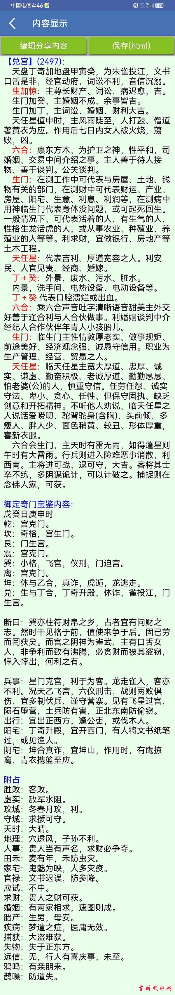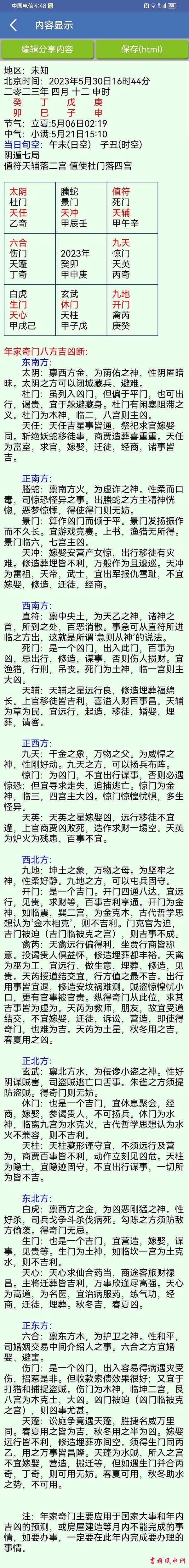 本软件注册费:6年期300元,3年期200元 有需要者加微信gn413168 适用于安卓系统、华为鸿蒙系统使用。 本软件年份跨度是1910到2060年. 本软件时家奇门排局采用两种方法:拆补法和置闰法,用户可根据自己的习惯选用,也可比较两种方法在使用中的准确率孰高孰低。可在程序菜单里的“选项设置”来设定。 张志春先生在其《神奇之门》里提倡使用拆补法,此方法只要掌握一定的规律,随时可手工排局。但置闰法一般要参考万年历,虽然五天一局,但在[芒种]还是[大雪]节置闰难有规律,且不同大师确定的置闰也不尽相同,因此参考奇门节元万年历比较方便。 本程序置闰法中的奇门万年历采用刘金喜主编的《通用易学万年历》(沈阳出版社1993年3月出版)。 “保存示例”可保存当前选定的起局年月日时等信息,针对“时家奇门”。注意要输入“示例名称”。 另外奇门遁甲知识菜单里有大量奇门遁甲资料,供学习参考。 |