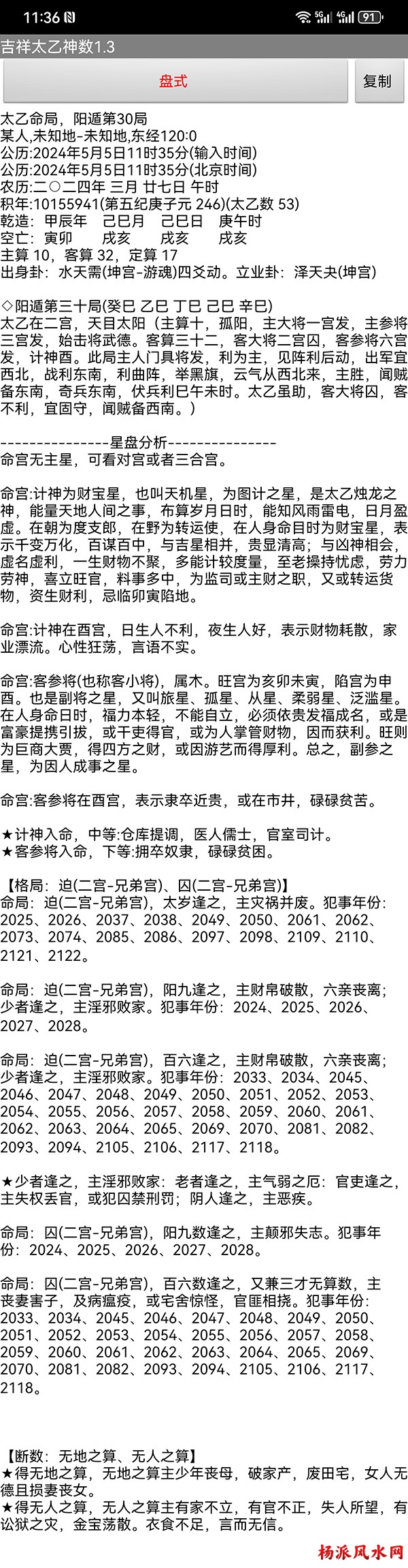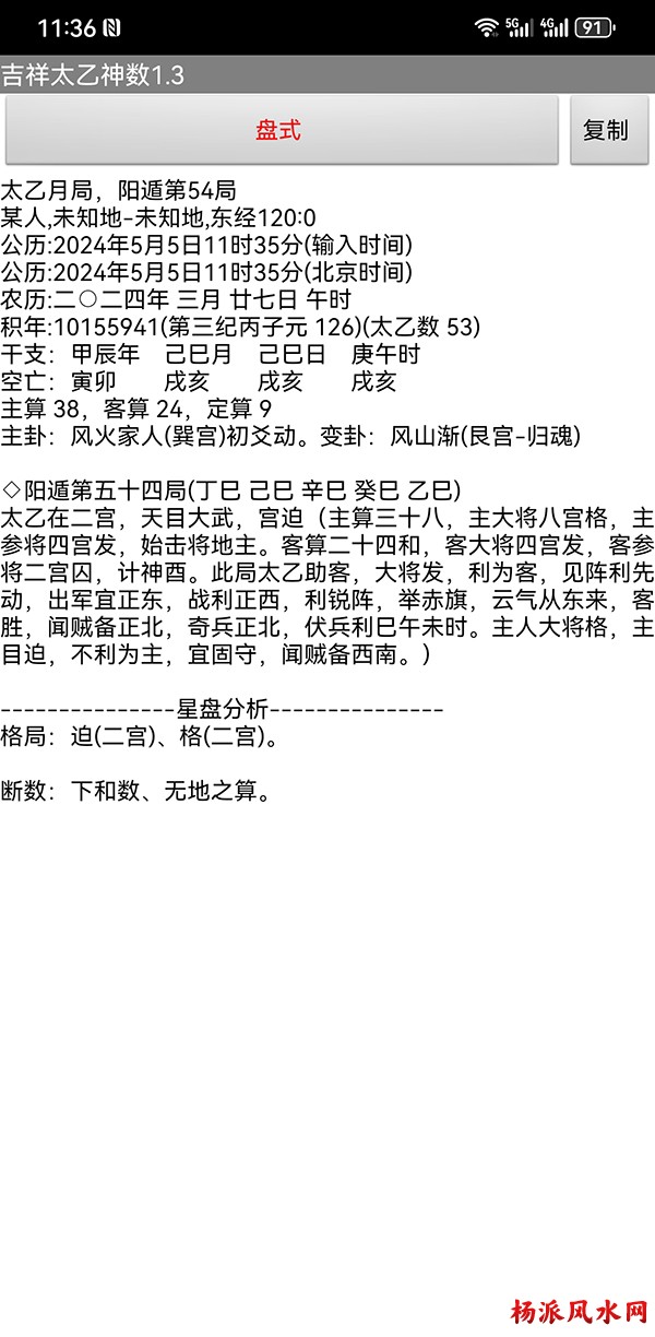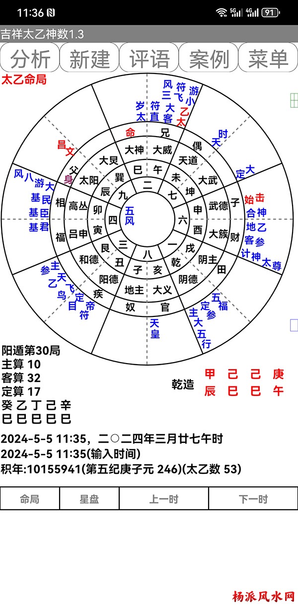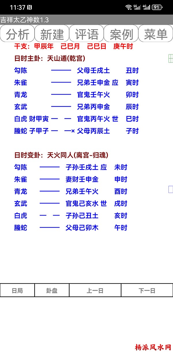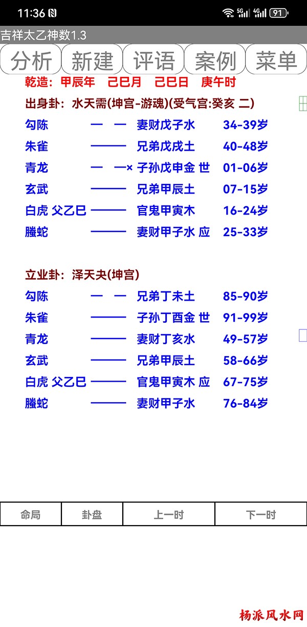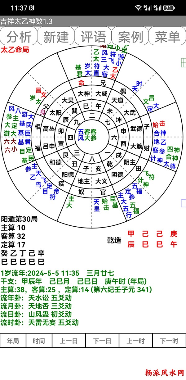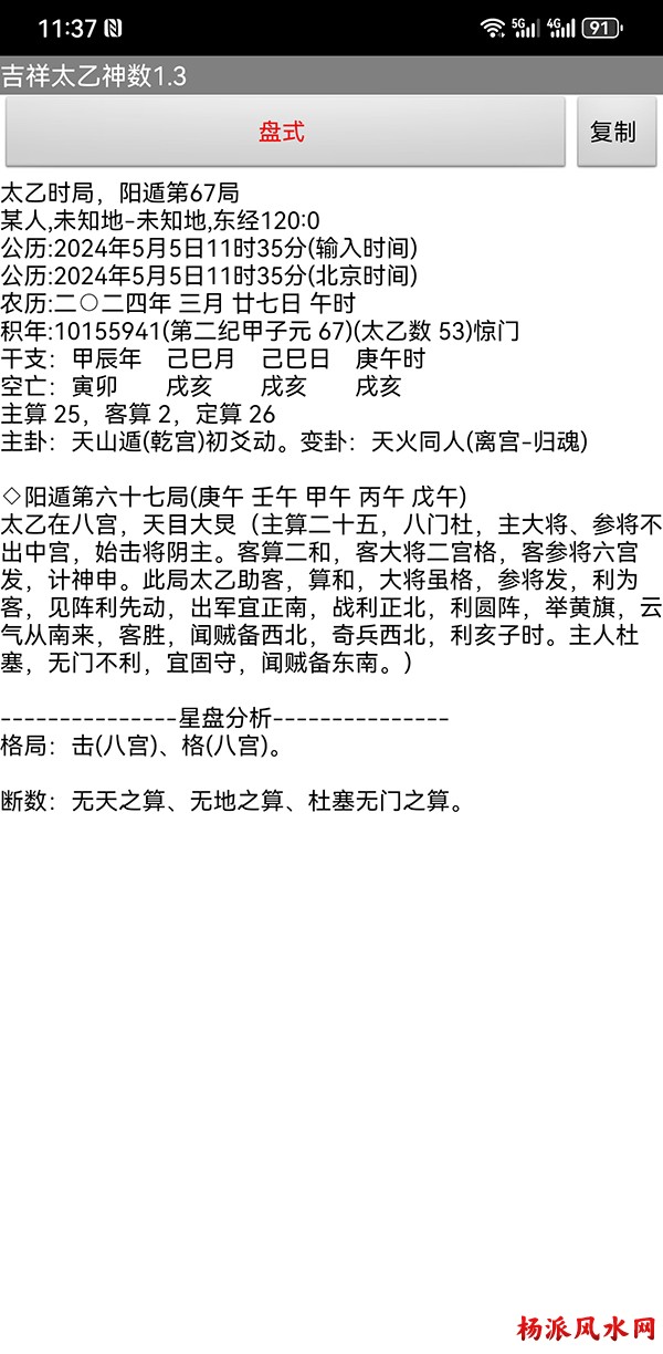 有需要加微信 gn413168 软件说明: 1:运行环境:安卓系统/鸿蒙系统 2:本软件为绿色软件,安装软件时只完成复制,卸载时直接删除,不会往你的系统文件夹拷入文件,不会 修改注册表,请放心使用,不带任何插件。 3:本软件为共享软件,未注册有功能限制,但没有时间限制。注册后你可以使用所有功能,并且享受软件 日后的免费升级,和使用时作者亲自提供的技术支持。 4:你可以分发、传播这个软件,但作者保持对软件的所有权。请不要对它进行反汇编、破解,谢谢你的合 作。 行生克制化的无穷联系,要灵活变通,不要完全刻板的按照软件给出的断语推断,如果由此造成一切不良后 果,由使用者自己负责,作者将不承担任何责任。 ============================================================================== ※杨派太乙神数 V1.3.1※ 2024.05.05更新 太乙号称“三式”之首,是一种比遁甲、六壬更神秘的预测术,理论研究、实际应用方面开发的很 少,本软件可以计算出预测需要的参数,可以绘出年局、月局、日局、时局、命局太乙盘,直观易懂,并显 示预测需要用到的数据,是命理研究者、爱好者的良好辅助工具。 一:使用帮助: 1:输入出生时间,公、农历在 -4713到9999年,合计 15000年。 2:选择预测地、选择预测人性别、输入姓名等。 3:选择盘式。 4:点按钮“排盘”就可排出一张太乙盘,点按钮“流年盘”可排流年盘(只有选择了 命局排盘,才可以排 流年盘) 几点说明: 1:排太乙命盘、流年盘时,本命盘的星用蓝色、红色表示,流年盘星用绿色、咖啡色表示。 2:几个星名用简称,主大=主大将,主参=主参将,客大=客大将,客参=客参将,定大=定大将,定参=定参 将 3:流年盘星名简称,小六=小限百六,大六=大限百六 相关太乙神数知识,可参考《太乙通解》、《太乙考证》、《太乙淘金歌》、《太乙数统宗大全》、《太乙 金镜式经》、《登坛必究》等书。 ================================================================================ 二:历史记录管理: 1:软件可以保存无限多的案例,并可以方便地查找、编辑、修改历史记录。 2:记录管理功能,可在软件左边的命例列表上查看右键菜单。 3:查看历史记录时,如果进行了修改,可以点击“排盘”按钮上方的“存旧”图标,保存修改后的文本。 4:菜单“文件->导出历史记录”可以把当前所有历史记录另存到指定的目录,适用于软件升级时保存旧版 本的记录(导出的记录,可以在安装后的新版软件重新导入) 5:菜单“文件->导入历史记录”可以把导出的历史记录重新加入现在的软件,使用此功能,将先清除现有 的记录。(此功能可以把旧版本的软件的历史记录导入) 6:菜单“文件->整理记录文件”将优化现有记录文件,读取提高速度。 7:软件启动时,只显示最近保存的最多 1000个案例,如果要显示全部或者查找指定类别,可以按鼠标右键 ,执行对应功能。 |