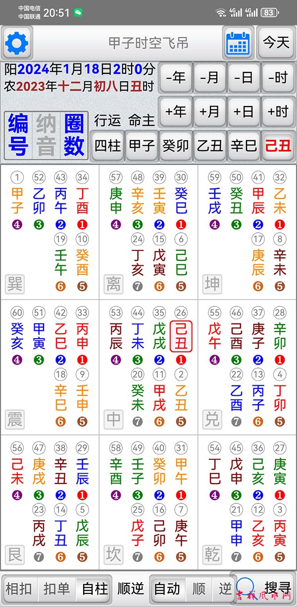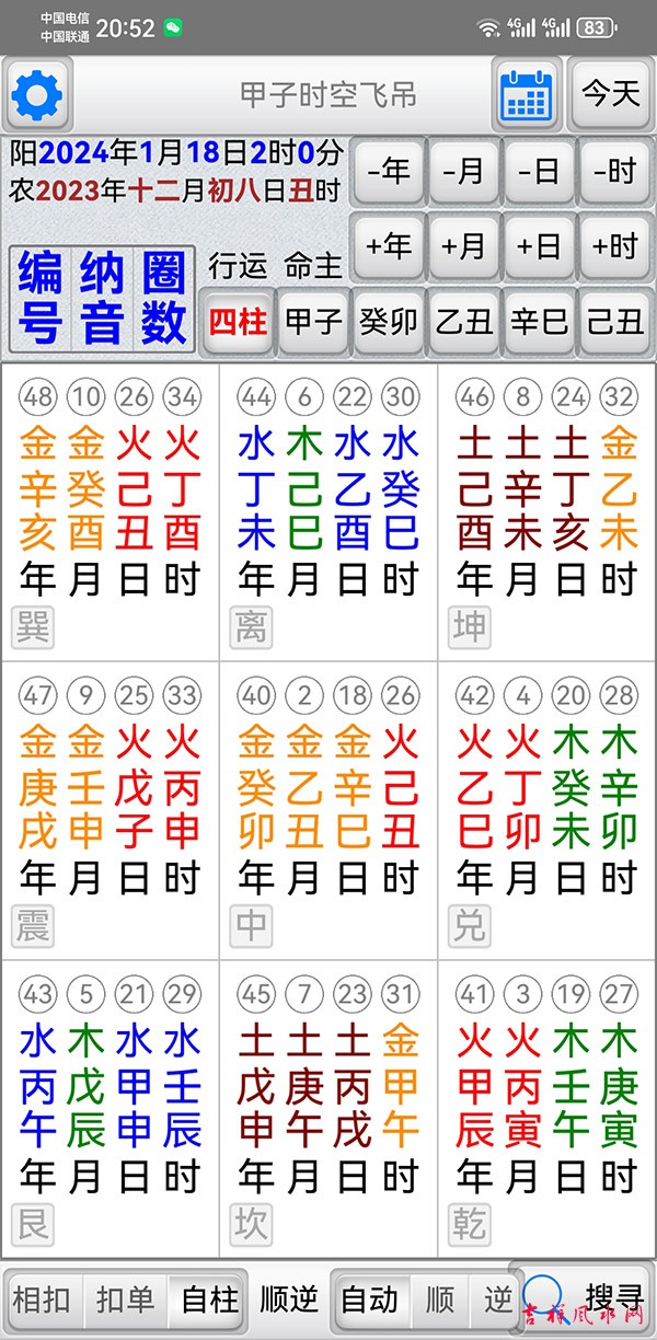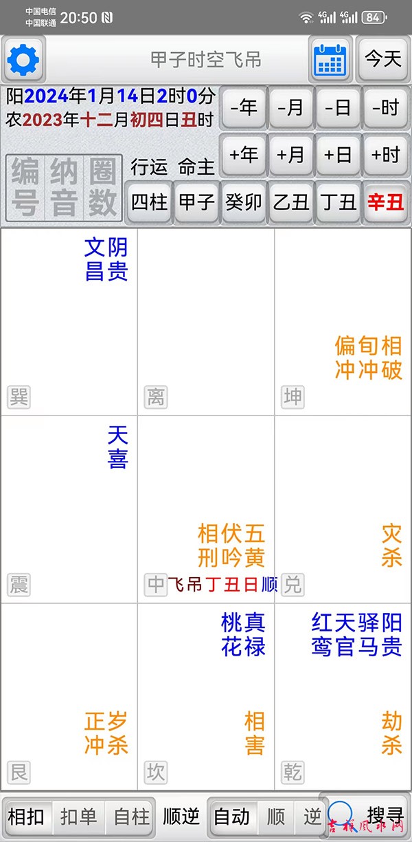 甲子时空飞吊软件 v1.2.2软件 有需要加微信gn413168 适用于安卓系统/鸿蒙系统 「甲子时空飞吊」是堪舆择日法的一种工具,它结合了天(时间)地(方位)人(命主)三种关系,找出吉的应用方位。 主要功能: 四柱:年、月、日、时之甲子入中飞吊九宫。 甲子: 输入命主干支入中,排出分佈於九宫的六十甲子。 显示年、月、日、时干支入中,排出分佈於九宫的六十甲子。 显示甲子的「编号」,甲子为1顺数至癸亥。 显示甲子的「纳音五行」(并以颜色区分纳音五行)。 显示甲子的「圈数」,即飞佈九宫的圈数。 神煞: 显示吉神:真禄、阳贵、阴贵、驿马、文昌、天官、红鸾、天喜、桃花。 显示凶神:五黄、伏吟、命破、劫杀、灾杀、岁杀、命刑、命害、旬冲、偏冲、正冲。 飞吊规则一(环环相扣): 选取命主按钮,以命主干支飞吊「命主」神煞。 选取流年按钮,以流年干支飞吊「命主」神煞。 选取流月按钮,以流月干支飞吊「流年」神煞。 选取流日按钮,以流日干支飞吊「流月」神煞。 选取流时按钮,以流时干支飞吊「流日」神煞。 以上一环扣一环,达到环环相扣。 飞吊规则二(单独飞吊): 选取命主按钮,以命主干支飞吊「命主」神煞。 选取流年按钮,以流年干支飞吊「命主」神煞。 选取流月按钮,以流月干支飞吊「命主」神煞。 选取流日按钮,以流日干支飞吊「命主」神煞。 选取流时按钮,以流时干支飞吊「命主」神煞。 以上单独与命主飞吊。 飞吊规则三(自柱飞吊): 选取命主按钮,以命主干支飞吊「命主」神煞。 选取流年按钮,以流年干支飞吊「流年」神煞。 选取流月按钮,以流月干支飞吊「流月」神煞。 选取流日按钮,以流日干支飞吊「流日」神煞。 选取流时按钮,以流时干支飞吊「流时」神煞。 以上单独与自己干支飞吊。 搜寻功能: 提供指定一个日期范围,并指定搜寻飞吊的项目、卦位及不可含的神煞,即可快速度到符合的日时。 指定搜寻飞吊的项目:可以只找年,或只找年月,或只找年月日,或找年月日时。 指定搜寻的卦位:可指定某个方位。(建议全选比较容易找到可用的方位) 指定吉卦位内不可含的神煞。(可依自己用事需求,选取想使用的神煞) 偏好设定: 週首日:设定一週开始的星期。 夜子时:提供夜子时设定。 语言地区:可随时切换介面语言,提供繁体中文、简体中文。 介面字型:提供字型大小调整。 萤幕锁定:不锁定可长时间使用,萤幕不会关闭。 ★ 万年历提供:西元 1600 ~ 2200 年。 ★ 操作介面:繁体中文、简体中文。 ★ 同时支援平板大萤幕任意方向显示。 |