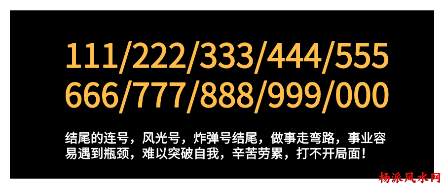 很多人认为手机号码末尾带6、8、9数字越多,或者号码是4连、5连甚至6连才为靓号。虽然从表面来看,此类号码具有一定规律的排列组合,确实为好号码,但真正吉祥的手机号码并不如此简单,选择吉祥号码一定要遵循这些规律。 一、五行确定尾数 根据五行与生肖首先判断适合的手机号尾数。手机尾数要把握1、6为水,2、7为火,3、8为木,4、9为金,5、0为土的原则。五行缺什么,要通过生辰八字科学的确认来判断,亦可通过属相的方法来选定尾数。 1、根据五行所缺选择手机尾号 如果你缺木,你就选择末尾数为3、8的手机号。如果你缺火,你就选择末尾数为2、7的手机号。如果你缺土,你就选择末尾数为5、0的手机号。如果你缺金,你就选择末尾数为4、9的手机号。如果你缺水,你就选择末尾数为1、6的手机号。 2、根据属相五行选择手机号码 (1)属虎、属兔人最佳手机号码 属虎、属兔的人是以木为用,那么,你适合选择的手机号码如下: 木=木:是你的帮助,所以你的手机可以选择3、8。 木克土:是你的财路,所以你的手机可以选择5、10。 水生木:是你的贵人,所以你的手机可以选择1、6。 (2)属蛇、属马人最佳手机号码 属蛇、属马的人是以火为用,那么,你适合选择的手机号码如下: 火=火:是你的帮助,所以你的手机可以选择2、7。 火克金:是你的财路,所以你的手机可以选择4、9。 木生火:是你的贵人,所以你的手机可以选择3、8。 (3)属龙、属狗、属牛、属羊人最佳手机号码 属龙、属狗、属牛、属羊的人是以土为用,那么,你适合选择的手机号码如下: 土=土:是你的帮助,所以你的手机可以选择5、10。 土克水:是你的财路,所以你的手机可以选择1、6。 火生土:是你的贵人,所以你的手机可以选择2、7。 (4)属猴、属鸡人最佳手机号码 属猴、属鸡的人是以金为用,那么,你适合选择的手机号码如下: 金=金:是你的帮助,所以你的手机可以选择4、9。 金克木:是你的财路,所以你的手机可以选择3、8。 土生金:是你的贵人,所以你的手机可以选择5、10。 (5)属猪、属鼠人最佳手机号码 属猪、属鼠的人是以水为用,那么,你适合选择的手机号码如下: 水=水:是你的帮助,所以你的手机可以选择1、6。 水克火:是你的财路,所以你的手机可以选择2、7。 金生水:是你的贵人,所以你的手机可以选择4、9。 二、易记顺口 易记顺口主要是从排列组合考虑,一看就能记住的号码,我们通常将它视为好号码。一般对号码,移动公司有个具体的划分标准,以尾数规则、尾数级别、号段等级来作为判断一个号码的好坏,如如:AAA、AAAA、5连、6连;ABCD、5顺、6顺;AABB、ABCD、ABAB、ABBB、AABBB、AAABBB等。 三、谐音吉祥 所谓谐音吉祥就是指风水意念好。0~9十个数字根据谐音,归纳如下:0—令,命令的令。1—要,要什么东西的要。2—爱,爱祖国的爱。3—善,善良的善。4—事,事情的事。5—福,福气的福。6—顺,顺利地顺。7—起,起来的起。8—发,发达的发。9—久,长久的九。 当然,这里只是举例,谐音有很多种,看大家怎样去理解联想。例如:13915977333—一生久要我久起起升升升!有文化内涵的手机号能把数字文字化,不但易记,而且传播一种文化精神,这就是谐音,同时还可以进行数文转换。 1、谐音码转化 汉语零、一、二(两)、三(仨)、四、五、六、七、八、九的同音字及音字;幺(1)、洞(0)、拐(7)的同音字及近音字,简谱叨(1)、来(2)、咪(3)、发(4)、骚(5)、拉(6)、西(7)的同音字及近音字,相应表示0、1、2、3、4、5、6、7、8、9。近音字不仅涵盖四种声调,而且包括对应的翘舌音,如“fa”。 2、形义码转化 形义码包括象形码和寓义码。象形码:“日、月、星、心、口、眼、球、灯、雨、泪、点、周、锁”等体现圆的事物的汉字表示“○”。寓义码:“剑、箭、针、塔、轴”等汉字表示“1”;“双、偶、俩、对”等均表示“2”。 3、转换码转化 转换码是由谐音码转换而来:我—吾(5);你、您—尔(2);他、她、它—伊(1);也—亦(1)。谐音码贯穿于0~9的每一个数字;象形码主要体现在0和1两个数字上,其次体现在3和8两个数字上,但各只有一个汉字;寓义码局限于1和2两个数字;至于转换码,除“也”以外为代词,只涉及1、2、5三个数字。也就是说,0、1、2、5、3、8除了谐音以外,还有象形码或寓义码或转换码,而4、6、7、9则只有谐音码。例如:2010010(爱心一环扣一环),2418279(爱是一杯双喜酒),7418618(喜事一把又一把)等等。 |