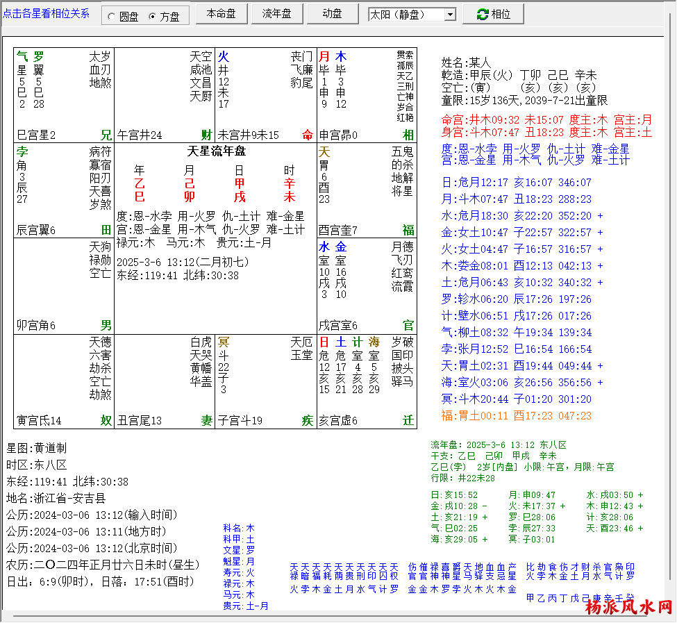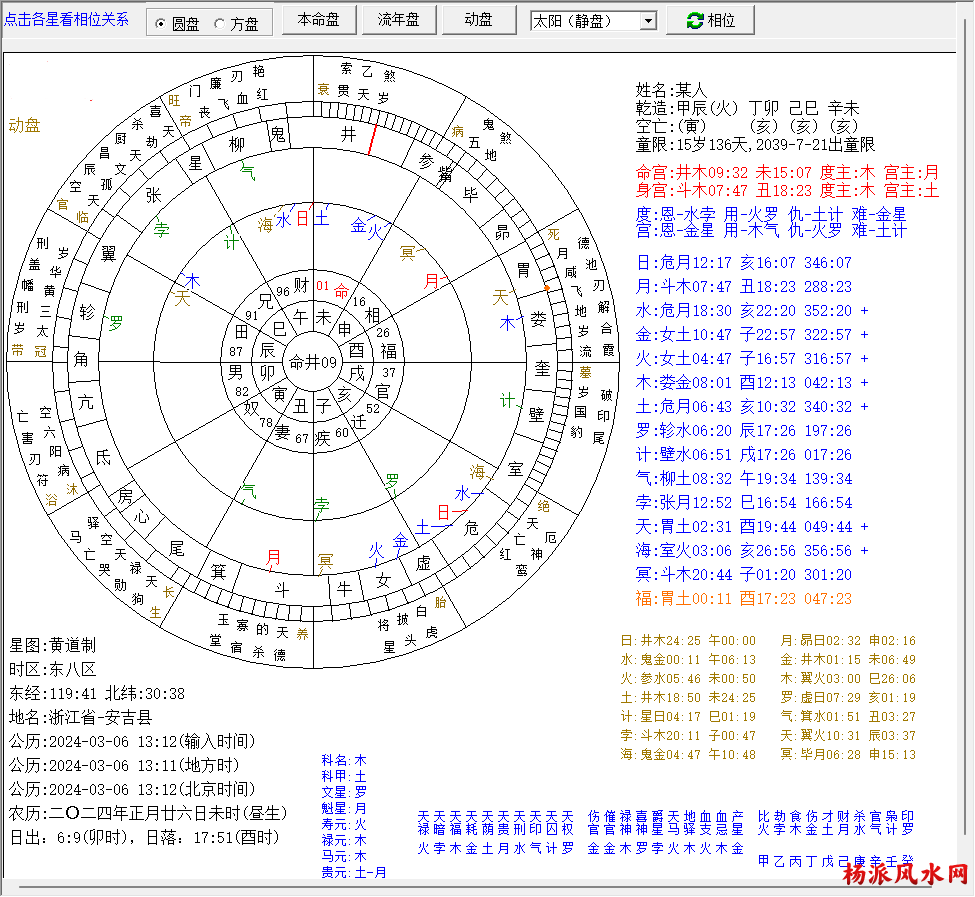 需要软件的加我微信gn413168 软件说明: 1:运行环境:win9x\winme\win2K\winXp\Vista\Win7\win8\win10\win11 2:本软件为绿色软件,安装软件时只完成复制,卸载时直接删除,不会往你的系统文件夹拷入文件,不会 修改注册表,请放心使用,不带任何插件。 3:本软件为共享软件,未注册有功能限制,但没有时间限制。注册后你可以使用所有功能,并且享受软件 日后的免费升级,和使用时作者亲自提供的技术支持。 4:你可以分发、传播这个软件,但作者保持对软件的所有权。请不要对它进行反汇编、破解,谢谢你的合 作。 5:作为一款专业的命理软件,它能求得星命所需的任何参数。但是应该知道周易的灵魂在于阴阳、五行生 克制化的无穷联系,要灵活变通,不要完全刻板的按照软件给出的断语推断,如果由此造成一切不良后果 ,由使用者自己负责,作者将不承担任何责任。 ============================================================================== ※七政星命 ※ 中国星命术,源远流长,最早可上朔至唐代。一代宗师张果著成《张果星宗》,用日、月、五星、四余 的关系来预测人的一生命运,本软件能根据出生时间排出星图,所有的星位关系在图上一目了然,使用专 业的天文计算方法,求得的星体位置达到了很高的精度,是了解、研究易学的良好工具。 使用帮助: 1:输入出生时间,公、农历在1600-2200。 2:设定时区,国内用北京时间(就是东八区,软件默认为这个区),一般可以不用改。 3:选择出生地以快速输入经纬度,也可直接输入经纬度。东经为正、西经为负,北纬为正、南纬为负。 比如东经117度48分、北纬25度42分,就输入 经=117:48 纬=25:42 比如西经117度48分、南纬25度42分,就输入 经=-117:48 纬=-25:42 4:点按钮“本命盘”就可排出一张本命盘,点按钮“限-流”或者“流年”可排流年盘。 其他星命知识,可参考《星度指南》《星平会海全书》、《星学大成》、《张果星宗大全》、《天步真原 》、《古今七政占星速成》、《古今七政五余析义》、《天星择日实务》、《天星择日精义》等书。 相关说明: 1:日出、日落时间都是真太阳时。 2:星后面的 + 指顺行,- 指逆行。 3:点击各星可以看相位关系,第一次点击看自身盘各星关系,第二次点击看和其他盘的关系(如果有内外 两个盘),再次点击不显示相位线。 4:里面的岁数都是虚岁,按立春分年。 --------------------------------------------------------------------- ------------------设置选项说明--------------------------------------- 一:财星简称:才、财,是指偏财=才,正财=财。 财、才,是指偏财=财,正财=才。 二:子时计算,有4种方式,针对23点 - 0点的子时特别处理,0点 到 1点的子时自然算入当日。 1:明日明时,日柱按第二日算,时柱按第二日子时算(时干随日遁)。(建议用此项)(不区分夜、早子 时) 2:明日今时,日柱按第二日算,时柱按今日子时算。 3:今日明时,日柱按今日算,时柱按明日子时算。(也就是常说的区分夜、早子时) 4:今日今时,日柱按今日算,时柱按今日子时算(时干随日遁)。 三:大运计算 1:公历精算,出生公历日期 + 起运年-月-日,得出精确起运时间。起运岁数 = 精确起运年 - 出生年。 (都用节气定年份、月日公历) 2:农历精算,出生农历日期 + 起运年-月-日,得出精确起运时间。起运岁数 = 精确起运年 - 出生年。 (都用节气定年份、月日农历) 3:民间简算,出生日到节入间隔天数,4天内,算一岁起运,5天起过3天加1岁,精度只到年。(用节气定 年) 4:盲派起运:参考盲派书籍。 四:童限计算方式 1:精确:出生日起加上童限行运的具体时间,计算到年-月-日,得到出童限的具体时间。岁数=这个时间 的年份 - 出生日的年份 + 1。(用节气定年,岁数用虚岁) 2:粗算:出生日加上童限行运的年数,得到出童限年的立春时间,做为出童限的具体时间。岁数=这个时 间的年份 - 出生日的年份 + 1。(用节气定年,岁数用虚岁) 3:旧版:按之前老版星命软件的计算方式。 ----------------------------------------------------------------------- 三:历史记录管理 1:软件可以保存无限多的命例,并可以方便地查找、编辑、修改历史记录。 2:记录管理功能,可在软件左边的命例列表上查看右键菜单。 3:查看历史记录时,如果进行了修改,可以点击“排八字”按钮上方的“存旧”图标,保存修改后的文本 。 4:菜单“文件->备份案例数据”可以把当前所有历史记录另存到指定的目录,适用于软件升级时保存旧版 本的记录(导出的记录,可以在安装后的新版软件重新导入) 5:菜单“文件->还原案例数据”可以把导出的历史记录重新加入现在的软件,使用此功能,将先清除现有 的记录。(此功能可以把旧版本的软件的历史记录导入) 6:菜单“文件->整理记录”将优化现有记录文件,读取提高速度。 7:软件启动时,只显示最近保存的最多 1000个案例,如果要显示全部或者查找指定类别,可以按鼠标右 键,执行对应功能。 8:文本案例(可以和安卓版八字软件互相导入-导出,共享案例,姓名相同的命例无法导入) 【导入生日文件(单个)】 【导入生日文件(多个)】 可以导入如这样格式的文本文件,一行一个命例,用于快速建立案例命库,文件名就是类别名。格式是 这样:“张三 男 2012-10-6-10:12 北京市-朝阳区"。(生日是公历,姓名、性别、生日、地址用空格隔 开,可以不输入地址) 【导出生日文件】 可以把软件里面的所有案例按一个类别一个文件,全部导出,格式如上。 说明:导入的文