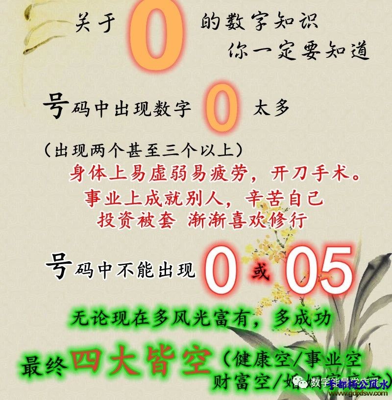 6、如果手机号码尾号数字是五鬼+六煞组合的:比如618、816,那么容易引发婚外情,三角恋等情况(五鬼加六煞婚姻有变化)。 7、如果手机号码尾号是祸害+五鬼,五鬼+祸害的组合:718、817、7118、8117、8017、7018、171、7108、8107、717、7518、8157、8517。容易有飞来横祸的大凶数字组合,定要尽快换掉,因为这是极大的负能量,严重会发生意外或血光,对身体健康和运势特别不利! 8、如果手机号码中有绝命+五鬼,五鬼+绝命的组合(特别是在尾号):218、812、8112、2018、2108、8012、8102、2518、2158、8512、8152。堪称宇宙最大凶数组合,会导致事业不顺,感情不顺,财运不顺,身体健康状况越来越差,甚至患上绝症等重大疾病! 9、如果手机号码中出现103、301、608、806等数字组合,且使用三年以上,会出现婚外情地下情,三角恋等情况。 10、高能量延年数字比如:19、91、159、109、78、87、788、758等帝王数字不适合女性使用,会造成性格强势,压力大,婚姻不顺的情况。 (全吉未必吉 全凶一定凶)——福虽未至祸已远离 (好号码) 祸虽未至福已远离(差号码)。 大家可以对照下自己的手机号码是否有以上几种情况?如果你认识的人手机号码里含有以上所说这些数字组合,可以善意的提醒一下换个号码使用。 正所谓"数字有吉凶,选号需谨慎",在选择手机号码时一定要结合自身命理来选,不能盲目!每个人先天命理不同,适合的数字数组自然也就不一样,并不是说吉星数组就是好,凶星数组就是不好,吉星用不好,那就是凶星,如果凶星得到合理运用,那就是吉星! |