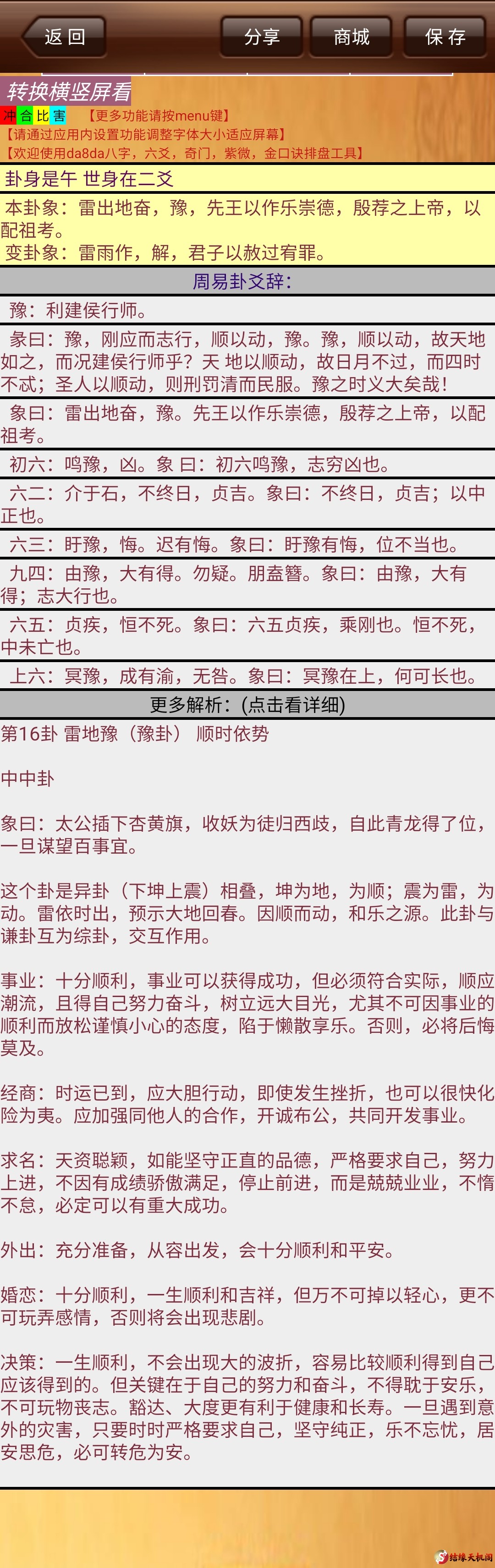 da8da六爻排盘是一款功能强大的六爻排盘软件。这款排盘软件不仅可以帮助用户预测吉凶,测财运、姻缘、天气等方面,而且可以随时随地进行排盘。其入式法简洁,判断精确,解断细腻,让人惊叹不已,仿佛神遇。适合安卓 ...