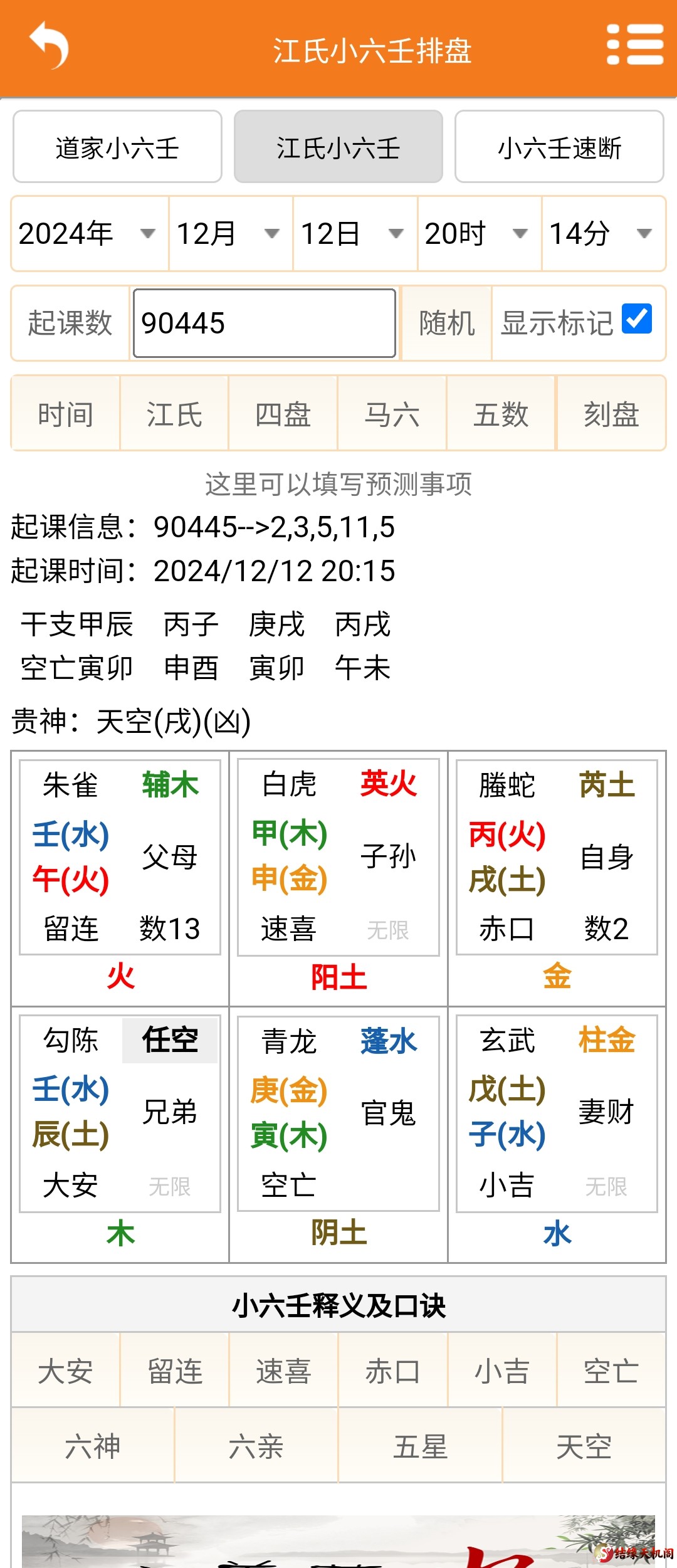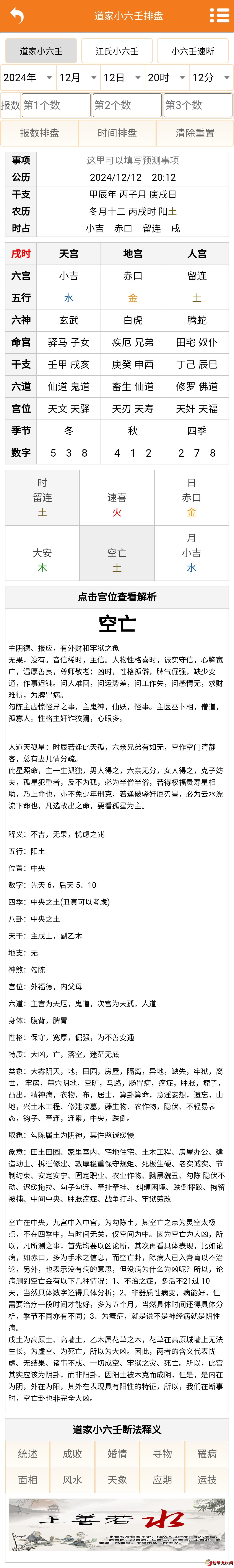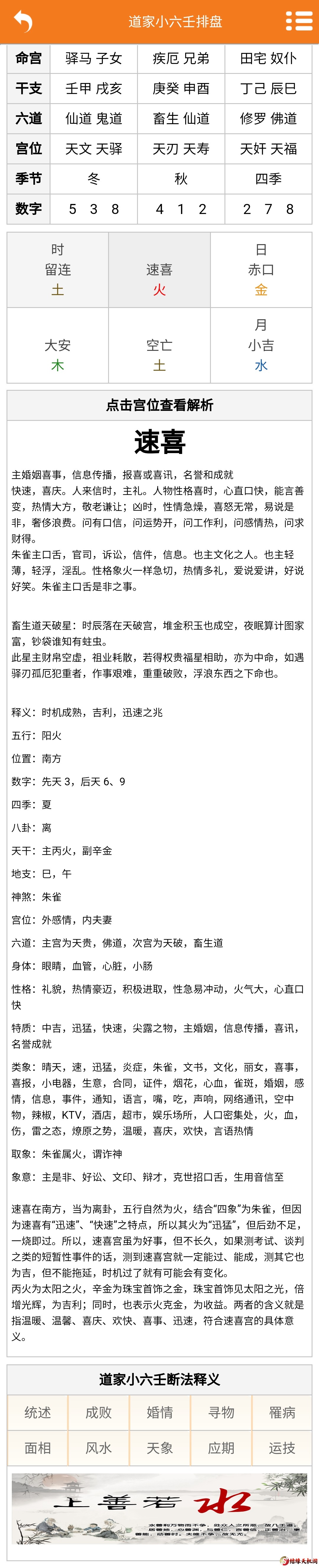 软件包含道家小六壬,江氏小六壬(时间排盘,四盘,马六,五数)小六壬速断等功能。