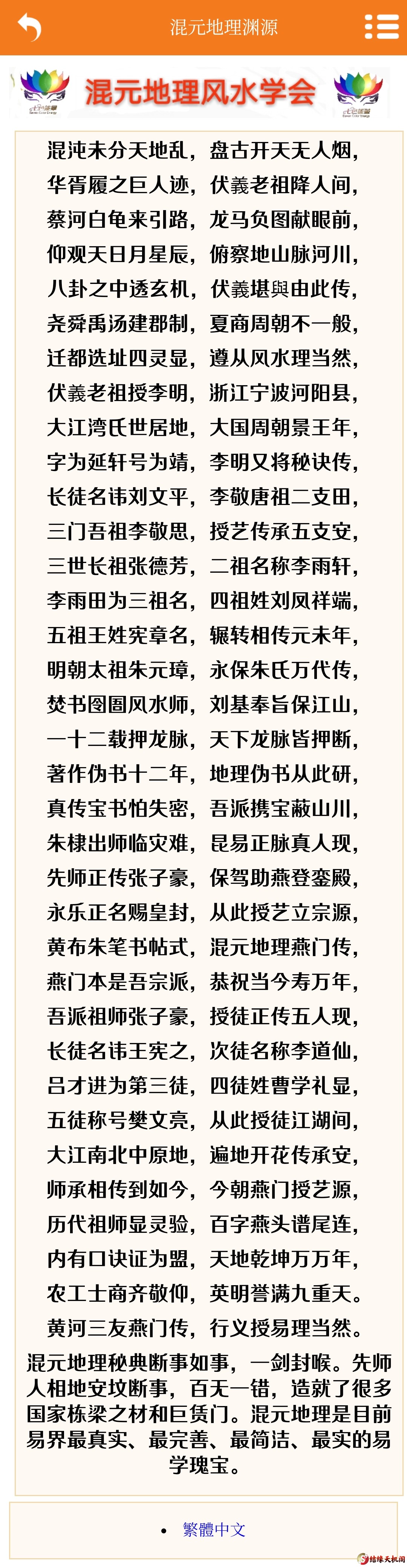 燕门混元地理一直在民间秘密相传,不为人所知,据恩师所传密本记载这派风水传承脉络来自大国周朝景王四年伏羲(伏祖)授浙江省宁波府河阳县大江湾人氏李明老师傅所传混元地理! 祖师:姓‘李’讳‘明’字‘延轩’号‘为靖。 李明祖师将‘混元地理’秘术授于三位弟子,长徒:刘文平,次徒:李敬唐,三徒:李敬思。 李敬思又授予五位弟子,长徒:张德方,次徒:李雨田,三徒:李雨轩 ,四徒:刘凤祥,五徒:王宪章,后经辗转历代相传。 以传至明代,朱元璋一三六八年立朝登基,朱元璋为保朱氏江山永固。下旨命国师刘伯温把阴阳真传宝书以火焚之,又把有名望的命理师与堪舆师送与大牢问罪。国师刘伯温又奉旨押龙脉一十二年,著伪书一十二载,后来地师无师承看伪书与人相宅安坟皆大错! 后有燕王朱棣出师有难,燕门混元祖师张子豪出山救驾助燕做銮殿有功。张子豪祖师得先师真传,重返江湖,开山立派,创立‘燕门’张子豪祖师以‘燕’字为头‘连’字为尾、谱百字辈序,以流芳百世。 燕王朱棣称帝后为本派‘混元地理’之术正名,御封本派“混元地理”为皇家专用地理。‘燕门混元地理’秘典永不外传,有弟子相传,无弟子以火焚之,不传入外人之手! 软件适用于安卓系统,也可制作网页版放公众号上。 如有需要加我微信:gn413168 |