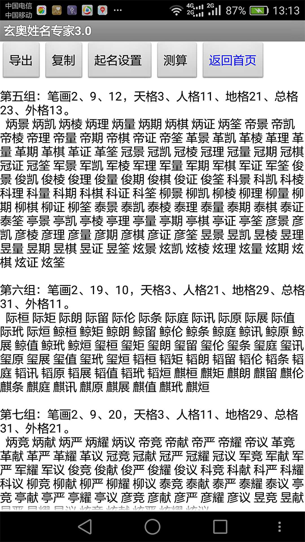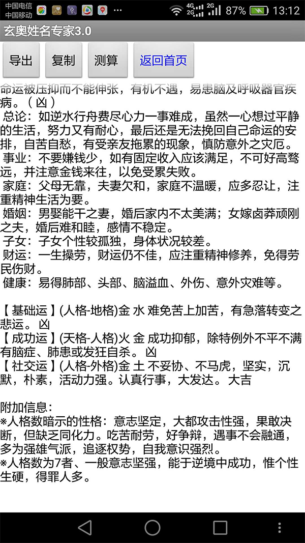 适用于安卓系统使用,鸿蒙系统使用 有需要者加微信gn413168 软件介绍: 姓名,蕴涵了人的精、气、神,传达着天地之玄机。从中国周易的角度来看,一个人的八字(出生时的干支)蕴含了人一生命运的所有信息,而姓名则可影响人的命运,好名可助人成功,坏名却会令人生蹇滞。此款软件以个人的八字配合姓名五格理论来研究姓名的作用,具有以下三大功能: 1:姓名分析--综合了八字和姓名五格、三才配置、81数理来评价姓名,并用百分制来量度姓名的好坏。 2:个人起名—按八字的喜用神和数理吉凶等,来找出有利的名字供起名时参考。 3:公司起名-为您的公司起一个好的名字,让事业发展更顺利。 4:姓名字典—有组合查询、笔画查询等灵活易用的查询方式,可快速找到想要的汉字。还有“81数理个人”和“81数理公司”的数理解释,支持数字和汉字两种方式查询。 3.1版升级改进 1:增加各省下辖市县区经纬度数据。 |