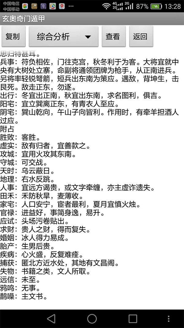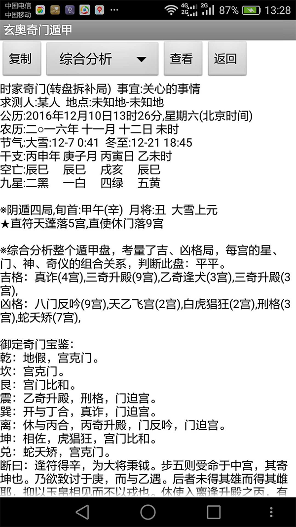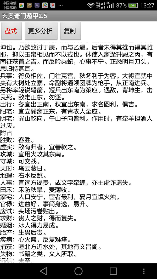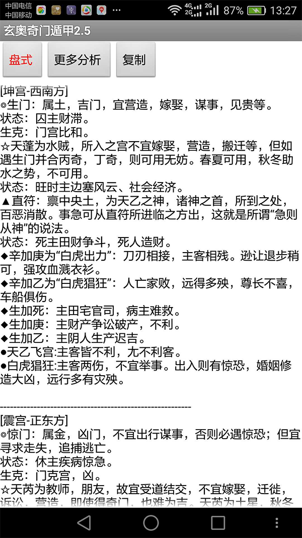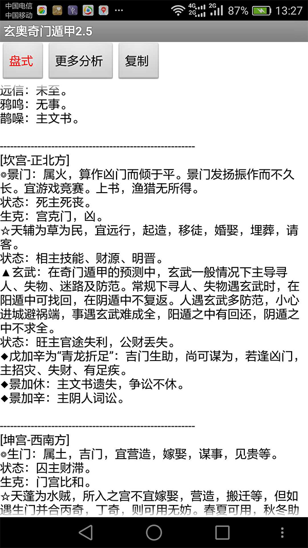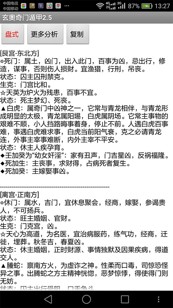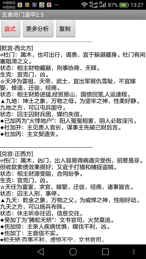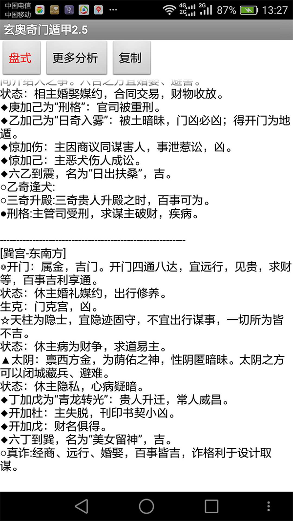 适用于安卓系统使用,鸿蒙系统使用 有需要者加微信gn413168 最新版本 2.6 运行环境:Android 系统 开发工具:Eclipse 软件介绍: 奇门遁甲-神秘的帝王之学,中国历史上的名人像黄帝、姜子牙、张良、诸葛亮、刘伯温等都把此术运用于行军作战,从而建立了盖世奇功。奇门遁甲做为易学高层次的预测术,为三式绝学之一,具有神奇的预测功能。本软件不但能完成奇门的排盘功能,还有一定的智能分析功能,具体有以下几大功能: 1:支持时家、日家、月家、年家、飞宫小奇门、阴盘时家、阴盘刻家、刻家奇门共8种奇门预测法。 2:详细解析奇门八宫的门、神、星、奇仪的意义和组合关系。 3:提供权威的《御定奇门宝鉴》以供预测时参考。 4:全面的排盘设置功能,可以用拆补法、超接置闰法、茅山法起局,可排转盘、飞宫两种盘式,等等还有其他一些派别使用的特殊选项,都可以自行设置成符合自己的排法。 5:分类保存无限多的历史事例,并可自由编辑,便于总结历史案例,提高预测水平。 使用安装问题: 1:软件运行平台:Android系统,最好是HVGA(320x480)的屏幕。 2:把“QiMen”这个文件拷贝到手机储存卡上,然后运行手机里的“文件浏览器”找到传过去的文件,点击运行,就可以开始安装了。 提示:如果无法安装,请先把“设置->应用程序”里面的“未知来源”勾上。 3:软件默认把事例数据保存到储存卡上,如果没有储存卡,将保存到手机内存里。(在软件“设置”里可以自行设置保存到储存卡或者手机内存里) 4:软件提供分类保存的功能,可以保存无限多的事例。 |