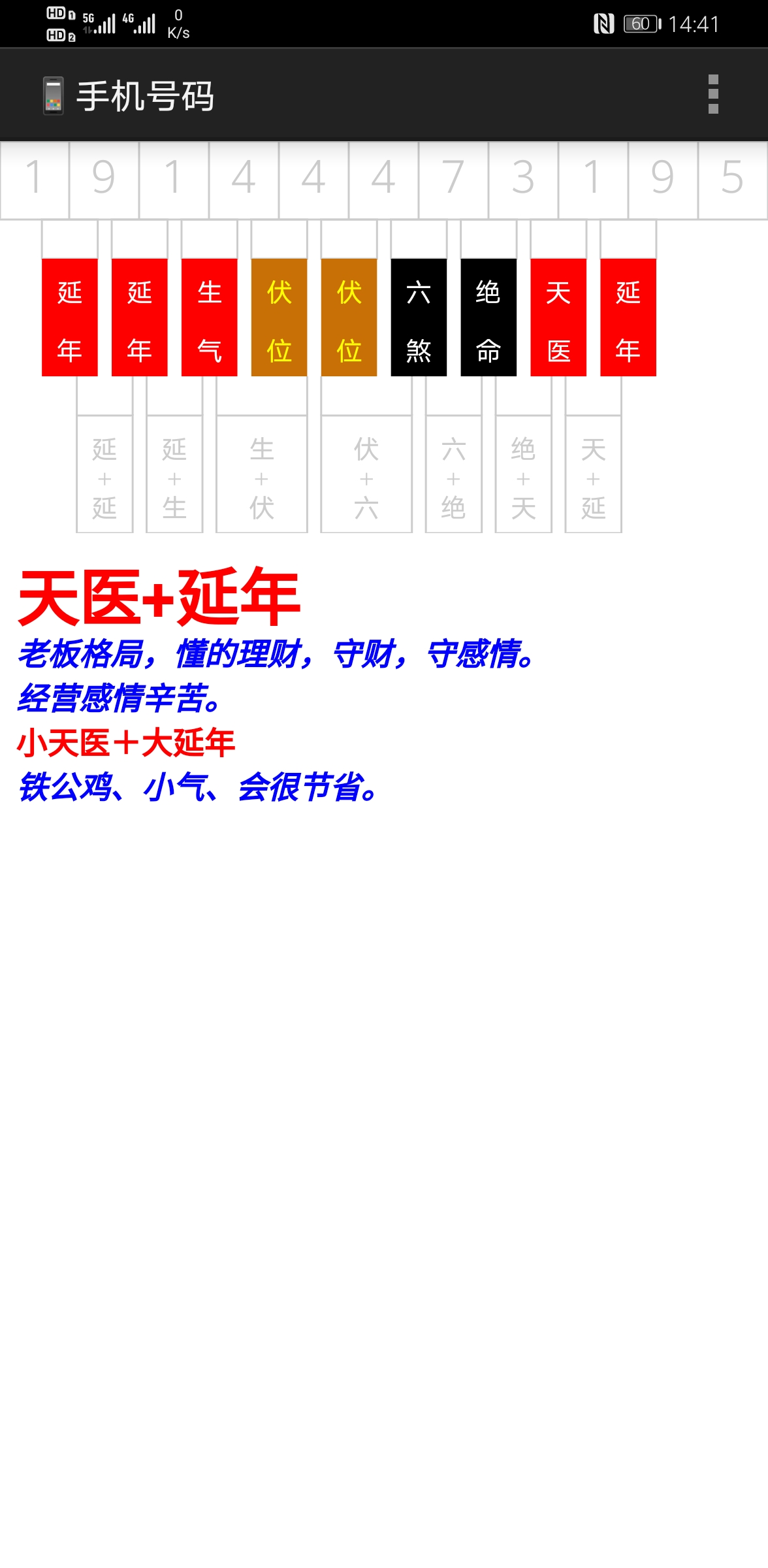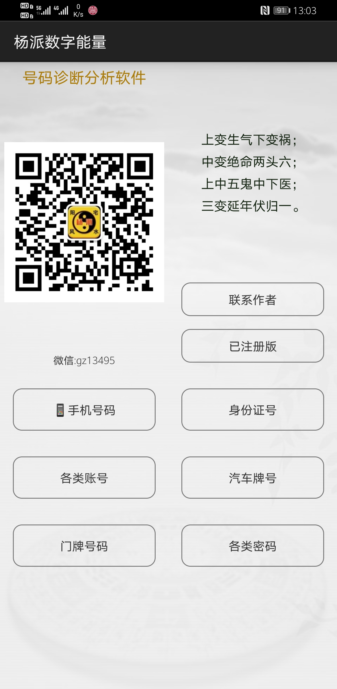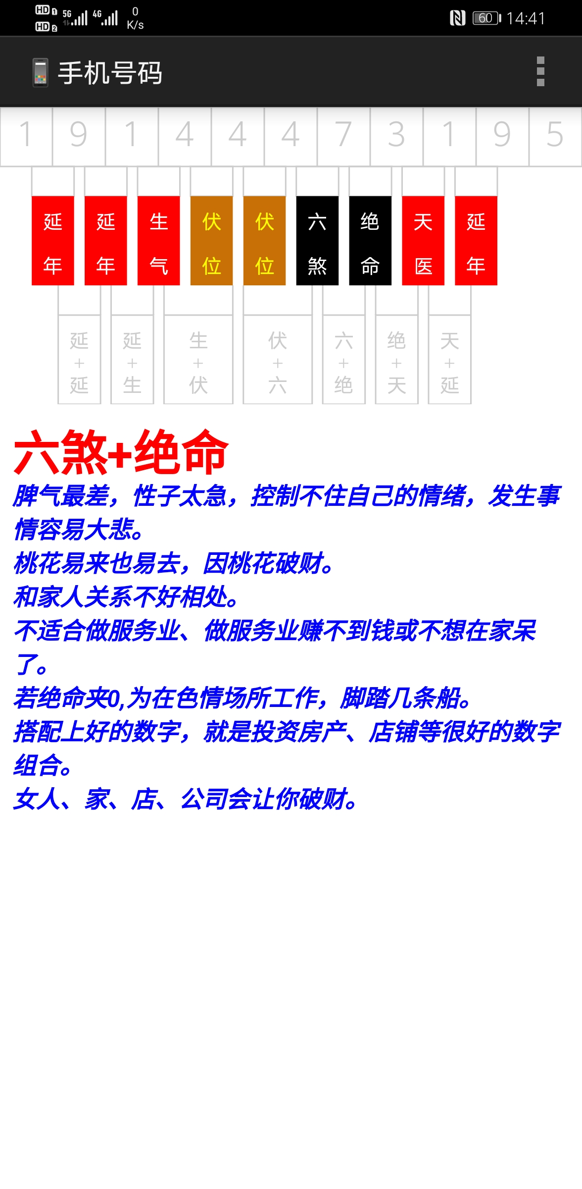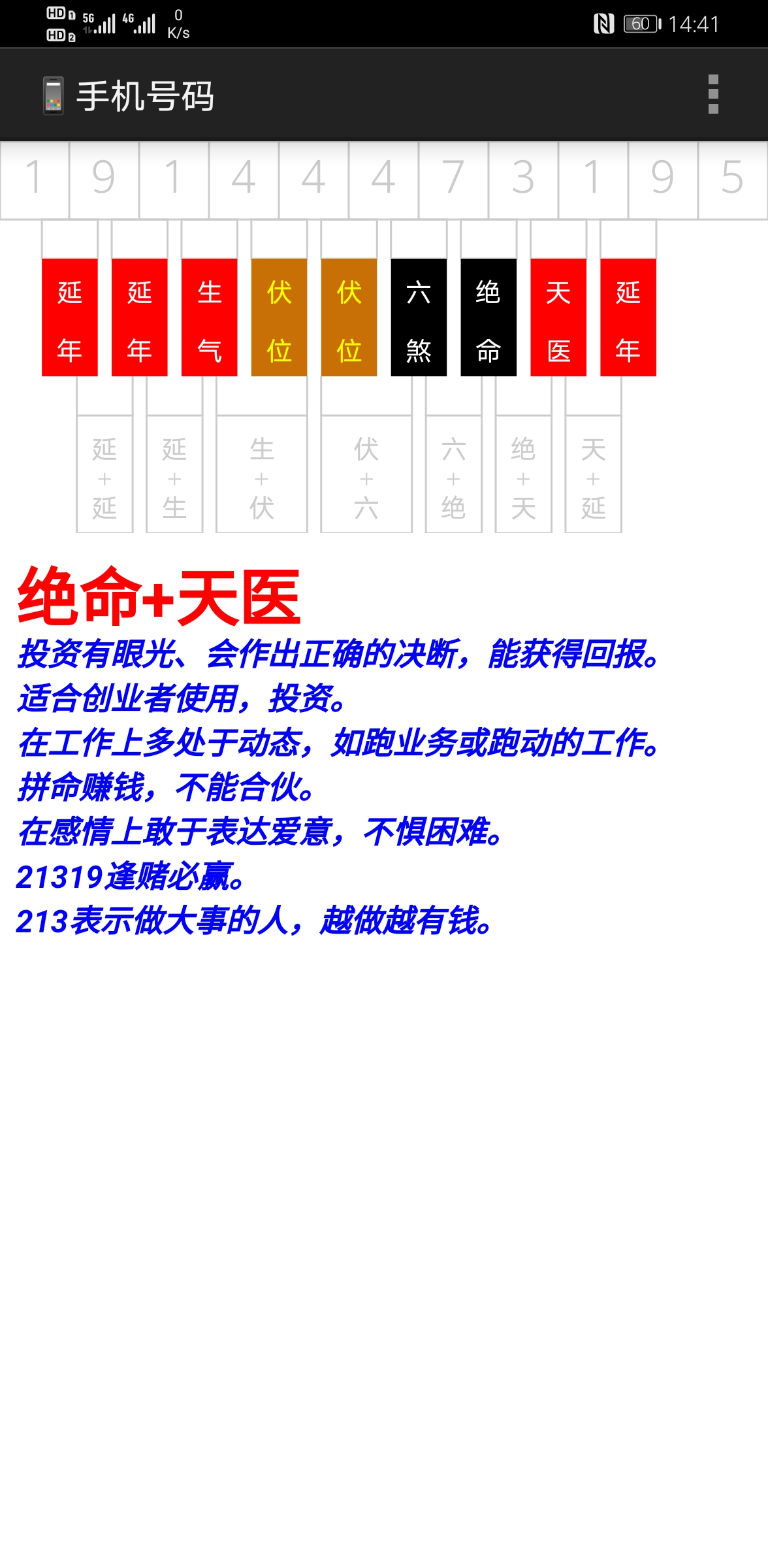 这是一款数字能量易学专业软件,非娱乐软件。 数字能量关乎您的事业、财运、身体、学业、婚姻感情等吉凶祸福,如手机号码、身份证号、微信号码、QQ号码、汽车号牌、银行卡号、门牌号码、各类密码,都是有能量的。经过易学工作者上万次验证,是真实有效的。
