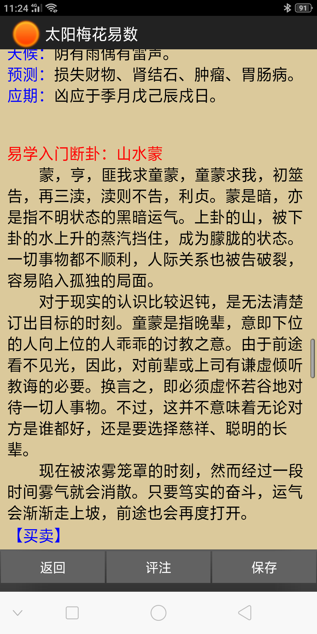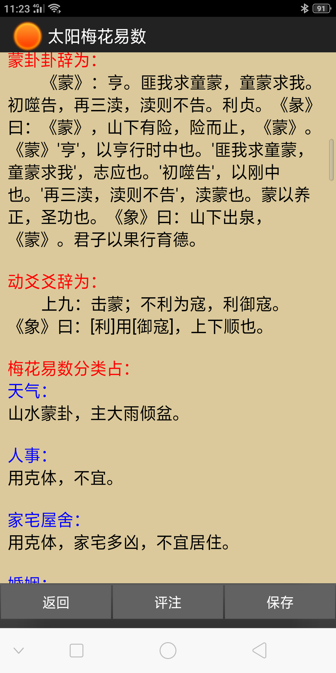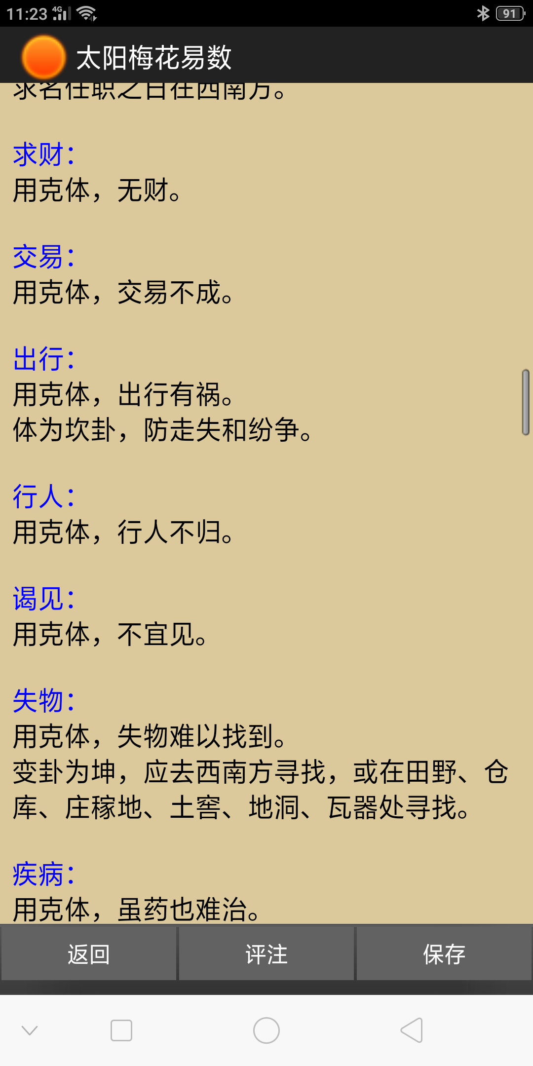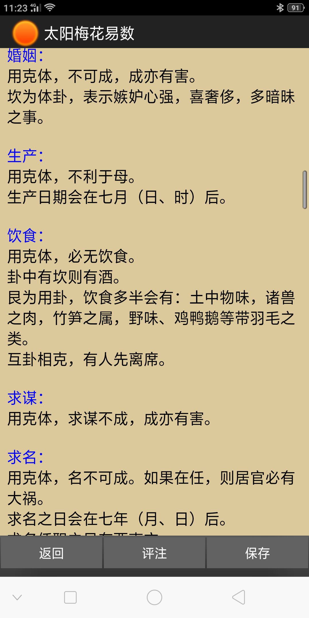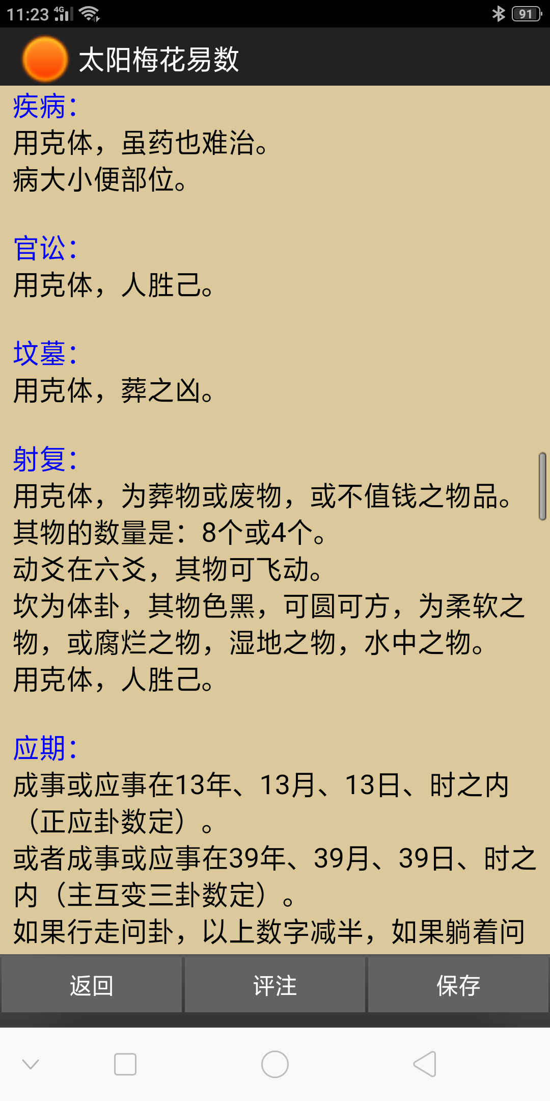 售价:168元 有需要者加微信gn413168 手机梅花易数 V2.15 本软件是手机梅花易数程序android版,android系统V2.1及以上版本手机和平板电脑,都可以安装使用。 本程序共有四个主页面,分别是:【新建梅花卦例】、【卦例显示】、【万年历】、【关于】页。 【新建梅花卦例】页,可根据选定的年月日时和你的基本信息及起卦方法,起出梅花卦来,勾选【保存此盘】按钮,可自动保存当前输入的信息; 【卦例显示】页,可列出保存过的卦例信息,【点击】所选卦例就可以排出卦例来,【长按】所选卦例就会弹出【删除卦例】的确认框,进行课例删除。 【关于】页,提供了【帮助】、【注册】、【分享软件】、【意见反馈】等选项。 每次点击【起卦】按钮后,程序会自动保存河洛日课内容到meihua.html文件,此文件位于您手机存储卡lcddata/meihua/文件夹里。您可以重命名此文件。这是浏览器格式文件,您可将此文件拷贝到电脑里,用IE等浏览器打开,然后可将内容拷贝到WORD等编辑器里编辑。 【内容显示】页,点击【保存】按钮,可保存内容为浏览器格式。点击【评注】按钮 ,可以输入你自己的评语,自动保存,可反复修改。 程序会自动备份保存的卦例文件到sdcard/lcddata/meihua/文件夹里,如果换存储卡或换手机,将lcddata文件夹整个复制到新sdcard里,这样就恢复了所有保存的卦例。 起卦年份介于1882-2030。 |