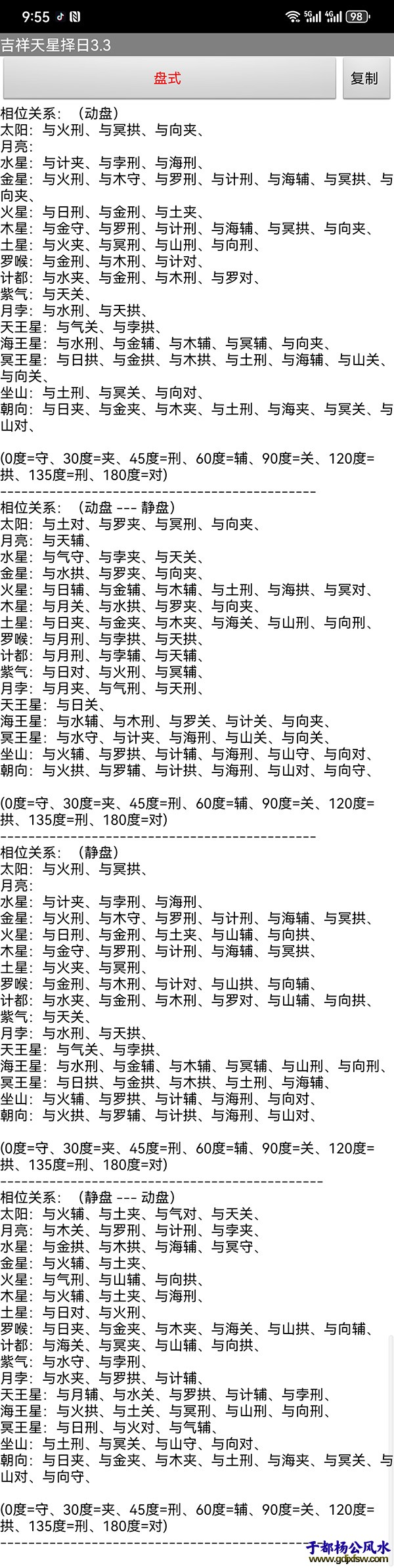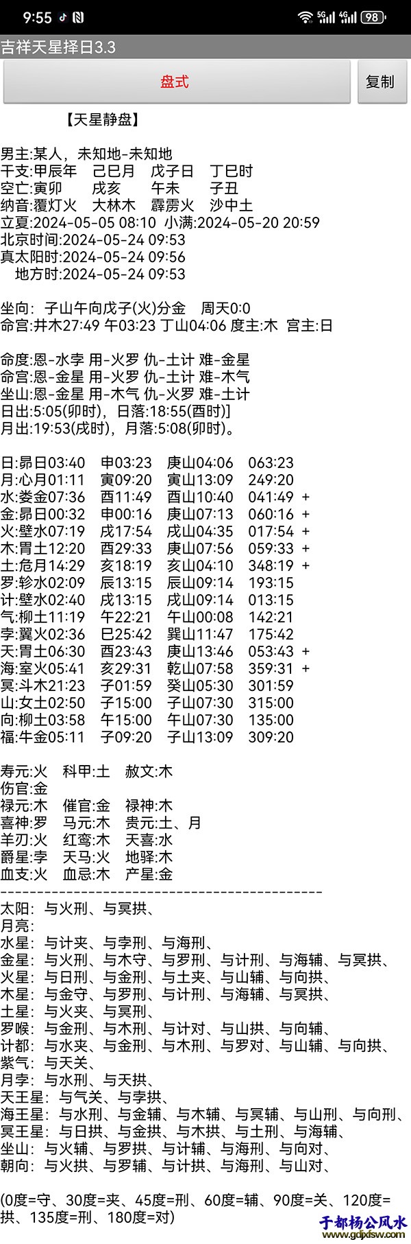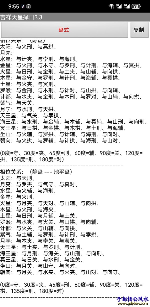 注册版:一年版本200元、两年版本300元、三年版本386元、终身版本668元 破解版可以任何手机上安装使用无限制686元 适用于安卓系统、鸿蒙系统 需要者购买加我微信gn413168 2024-05-19更新3.3.00版本 增加电子罗盘转动功能、地平盘、方盘、软件相关设置功能增加与之前错误修正,另增加导入户型图功能。 过往我们要进行天星择日,那么就需要有各种的推算过程,往往需要大量的精力来计算,有时候由于人为疏忽还容易产生错误,导致择日结果相差甚远,往往就达不到想要点效果。 现今时代在发展,我们已经可以借助软件排盘来节省大量的人工计算排盘过程,并且软件排盘推算方式与人工无异,并且结果会更加准确,不会出现人工计算的疏忽错误。 我们只需要输入相应的时间,地点,择日类型,坐向,周天度。 现今时代在发展,我们已经可以借助软件排盘来节省大量的人工计算排盘过程,并且软件排盘推算方式与人工无异,并且结果会更加准确,不会出现人工计算的疏忽错误。 我们只需要输入相应的时间,地点,择日类型,坐向,周天度。 |