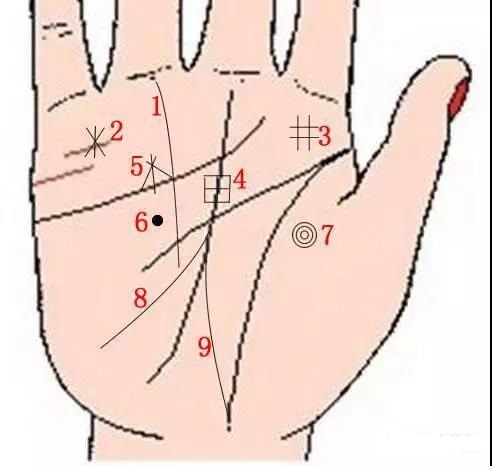 手相中的九大财富纹主要是提示你发大财的信息,也就是说,如果你手中只要有此九大财富纹中的其中之一,你这一生中就非常有可能发大财。与此同时,从这些财富纹中还可以解读出你发大财的方式、发大财的程度、发大财的相关因素等等。对照手相的财富纹,了解自己的发财路,把握机遇,点亮人生。 一、财运纹(如图所示1):在无名指下方直冲无名指的竖线,为财运线。你若有此线,说明你很具商人的天赋。你如果是从商求财,必定是财如流水,连绵不断。此外,有此纹者也说明你很善于理财。 二、星形纹(如图所示2):在小指下方的水星丘处出现,一是代表你有意外之大财、横财可得;二是代表你的子女的财运也会不错,可享子女之福。 三、井字纹(如图所示3):在食指下方的木星丘处出现井字纹、十字纹等之类的,说明命主在事业上将具有较大的影响力,并会因此而获利巨大的财富。 四、田字纹(如图所示4):在事业线、生命线附近出现田字纹、口字纹等之类,田字纹说明命主比较适宜从事诸如房产、土地、土产、矿业等行业,而口字纹则说明比较适宜从事培训、咨询、律师等行业并因此而发财。 五、豪宅纹(如图所示5):豪宅纹位于无名指的下方,在天纹线的上方,又称金房子。有此纹者,必发亿万之财,多路进财,易跨行业经营、经营集团公司等。 六、黑子纹(如图所示6):当你的手心中有黑子纹时,你会因你对自己所具有的某项才能执着追求而出类拔萃,并且因此会大发其财。方舟周易温馨提示,当然自然握拳时,黑子纹正好须正好在拳头内。 七、公印纹(如图所示7):公印纹因其象我们生活和工作常见的公章而得名。手相中有公印纹的人适宜从事与政府部门的人打交道较多的行业或工作,且会因此而成为富翁、富婆。 八、遇贵纹(如图所示8):遇贵纹起于乾宫与手中的事业线相连。手相上有遇贵纹的人,意味着事业上有亲和力、善于际、人缘好,容易受到他人有力之帮扶,故若从事业务、市场、公关等,必定发财无疑。 九、祖庇纹(如图所示9):祖庇纹顾名思义,说明有此纹者根基不错,易因得长辈之荫庇、继承祖业而发财,即富二代之类也。此手纹起于坎宫与手中的事业线相连。先的荫泽,而且老公的事业也顺风顺水。 |