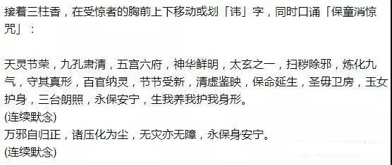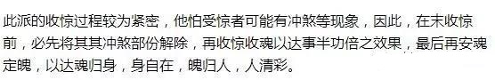 说人有三个魂七个魄,魂可以游走。魄是人体的本源,是时刻不能游离,自有生命之时刻起就存在,离开必死,死必离开。 李时珍《本草纲目·人部第五十二卷·人魄》里还是味药,时针曰:“盖人受之阴阳二气,合成形体,魂魄聚则生,散则死。死则魂升于天,魄降于地。魄属阴,其精沉沦入地,化为此物;亦犹星陨为石,虎死目光坠地化为白石,人血入地为磷为碧之意也。” 《淮南子·说山训》卷十六:“魄问于魂曰:‘道何以为体?’曰:‘以无为体。’魄曰:‘无有形乎?’魄曰:‘无有。’魂曰:‘无有何得而闻也?’魂曰:‘吾直有所遇之耳。视之无形,听之无声,谓之幽冥。幽冥者,所以喻道而非道也。’魄曰:‘吾闻得之矣:乃内视而自反也。’魂曰:‘凡得道者,形不可得而见,名不可得而扬。今汝已有形名矣,何道之所能乎?’魄曰:‘言者独何为者?’魂曰;’吾将返吾宗矣。‘魄反顾魂,忽然不见,反而自存,亦以沦于无形矣。” 以下有各派收魂法及民间收魂法,方法太多,以前玄灵群大师们聊天中发出来的,现在几个合并叫军师府了。下文是群聊天汇集整理自行参考。 军师府常用收魂目录 正一神霄派收惊经咒 三奶派收惊经咒 鳯阳派收惊经咒 禅和派收惊经咒 闾山派收惊经咒 民间收惊经咒汇总 《移神换将》小儿惊吓收魂法 贵州招魂的仪式 招魂咒 收魂法 真传拘魂咒 拘魂式 土方法 正一神霄派收惊经咒 先以三柱香禀报坛中众神 拜请收魂三师三童子。收魂仙人童子郎。不收别人魂不讨别人魄。单单收返000几月几日几时几岁左三魂,右七魄,收在本身宫来相寻,神兵火急如律令, 急急如律令。 同时以金光指写灵字于手心,再以手心印在受惊者的百汇上灵空金龙,统领二十八宿星,速速收返某某三魂七魄归本宫,神兵火急如律令,急急如律令。 一写不玄天。二写不玄地。三写收关煞。四写收返某某某三魂七魄来相寻。奉九天玄女敕令。收你胆大大不免惊收你一更好咽。二更好眠。三更无灾。四更无厄。五更保平安。天皇皇。地皇皇。一夜度天光。日来无灾厄。夜来无灾殃。顺手平安。 太上台星。应变无停。驱邪缚魅。保命护身智慧明静,心神安宁。三魂永久。魄无损倾。魂来归宫。魄来扶体。三魂七魄归本宫神兵火急如律令(金光神咒) 魂魄收到头好利楼。收到耳好利利,无着惊无塔艾,平安造化时。 (迎请老君玉印,并以老君印配合如下之咒语一一的执行之) 老君玉印四角又四方。老君名字在中央。左天兵。右六甲。天兵六甲两相随。天上日月团团转。游行天下救良民。迎请老君玉印。印在某某某头中有灾印来头中退。心头有灾印过心头安,左手脉印来收三魂,右手脉印来捉七魄,脚者背印来也轻健。印在衫领过、寿元吃得百外岁,三魂七魄本身来相寻。魂到魄回收惊完明急急如律令。 第二型式:为《灵宝正一北斗本命延生妙经》的「玄灵咒」系利用此一较简单的收惊法即用三柱香拜请坛中众神作主,接着以此三柱香或可用剑指在其胸前划「雨渐耳」的组合字,同时配合如下之咒语︰ 天灵节应,愿保长生,太玄之一,守其真形,五脏神君,各保安宁,三魂七魄归本宫神兵火急如律令,急急如律令。 第三型式:为《灵宝正一北斗本命延生妙经》的「北斗经咒」系利用此一较简单的收惊法即用三柱香拜请坛中众神作主,接着以此三柱香或可用剑指在其胸前划「雨渐耳」的组合字,同时配合如下之咒语︰ 北斗九宸,中天大神,上朝金阙,下覆昆仑,调理纲纪,统制乾坤,大魁贪狼,巨门禄存,文曲廉贞,武曲破君,高上玉皇,紫微帝君;大周天界,细入微尘,何灾不灭,何裙不臻,元皇正杰,来合我身,天呈所指昼夜常轮,俗居小人,好道求灵,愿见尊仪,永保长生,三台虚精,六淳曲生,生我,养我,护我身形,(加默念北斗七星--魁……),尊帝急急如律令,三魂七魄归本宫神兵火急如律令,急急如律令。 三奶派收惊经咒 此派之收惊法之过程分为三个阶段,是先以三柱香朝坛内主神及众神禀报后,再以此三柱香在受惊者胸前上下来回滑动,同时口诵「收冲煞咒」,先收冲,次收惊,再加收魂;如有冲煞到,就以此程序念完收冲煞咒,如无冲煞者,一至二岁小可用到此,就不必加即收惊。 (1)收冲煞咒: 祖师来收冲,王母仙娘来收冲,三位皇君奶娘来收冲,本家香火来冲,收去幼童(女)天来冲,地来冲,年(月)来冲,日(时)来冲,人客来冲,金银财宝来冲,六畜树木来冲,诸邪冲气娘收去,一切灾殃化微尘,五奉大奶夫人敕,急急如律令! (2)收惊咒: 祖(本)师来收惊,王母仙娘来收惊,三位皇君奶娘来收惊,(或在坛或在家收者)称本坛圣驾(本家香火)来收惊,收转幼童(女)天来惊,地来惊,年(月)来惊,日(时)来惊,六畜(咱动)得惊,大声(斗)得惊,路途跋跌得惊,收转幼童(女)子丑寅卯辰巳午未申西戌亥,十二生肖惊,天苍苍,地皇皇,幼童(女)何处得惊惶,大奶皇君亲收转,安眠好咽到天光,急急如律令! (3)收魂咒(夫人咒): 祖本(仙)师来加魂,加上幼童(女)头额魂,眼(鼻)中魂,左(右)耳魂,身前(后)魂,身左(右)魂,左(右)脚魂,身上子丑寅卯辰巳午未申西戌亥十二生肖魂,十二星辰魂,三百六十骨节毛吼魂,三魂连七魄,七魄连三魂,三魂七魄奶收转,交付幼童(女)身上存,吾奉大奶皇君勃,急急如律令! (4)收惊神咒: 天灵灵,地灵灵,神威灵,奉请收魂三师三童子降来临,今有南瞻部洲中华民国台湾省00县(市)00乡{镇)00村(里}00巷00号,弟子000三魂七魄走四散,奉请收魂三师三童子,带起收魂衣